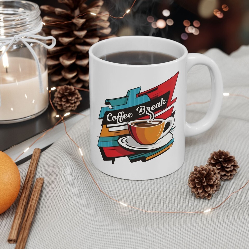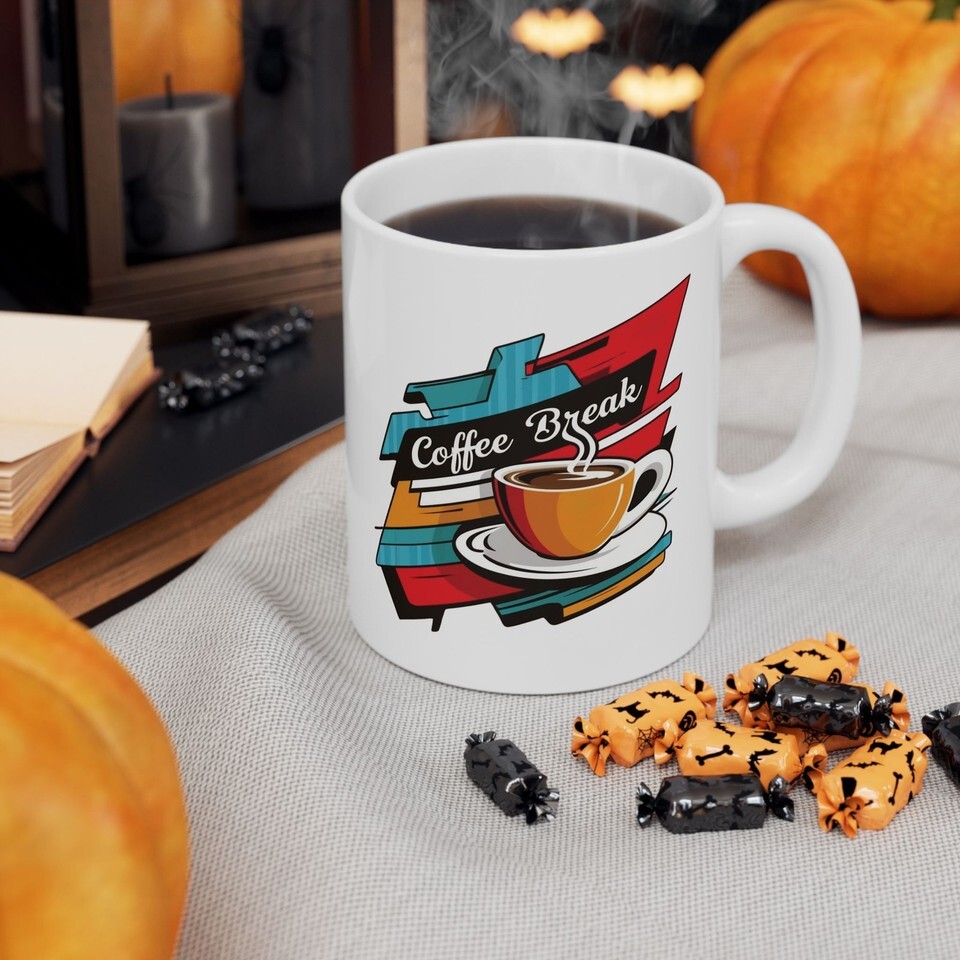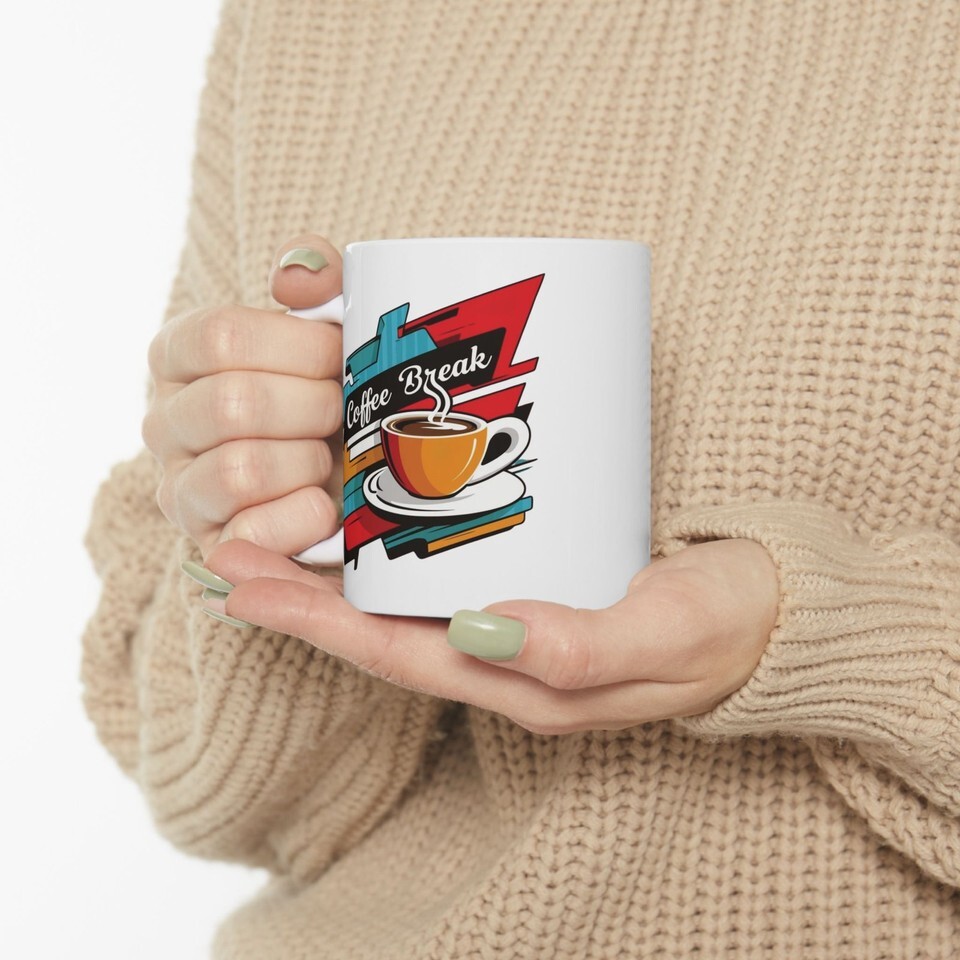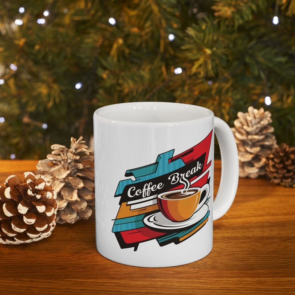 Bright, glossy ceramic mug that brings a playful, retro-inspired illustration into your everyday coffee or tea ritual. The crisp, vibrant print wraps the white surface with bold colors and layered banners, giving each sip a little moment of charm and nostalgia. The comfortable C-handle and shiny finish feel familiar in hand; 11oz size suit quick morning cups or longer, slow-sip breaks. Built to be used daily?microwave and dishwasher safe, and made from durable, lead- and BPA-free ceramic?this mug keeps the artwork vivid while standing up to everyday life.