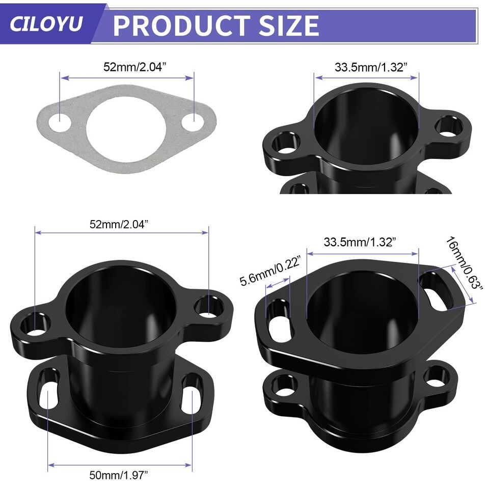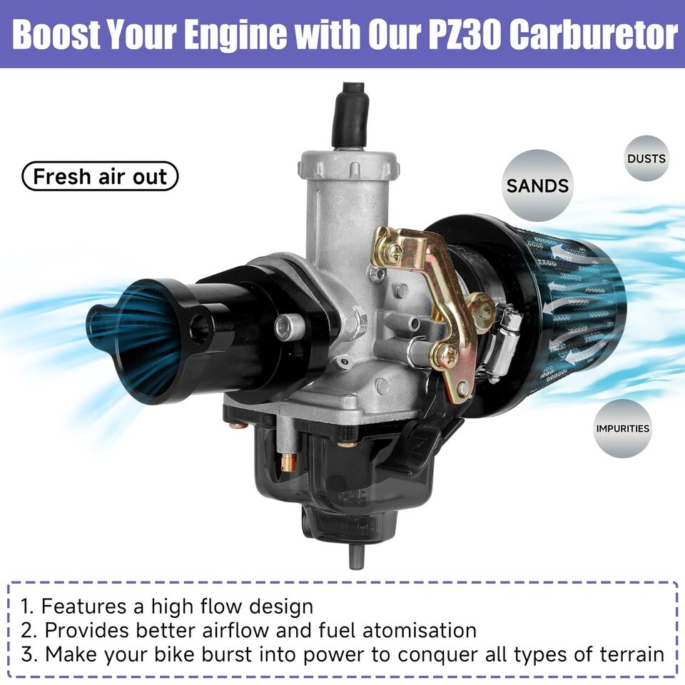Package Includes: 1 * PZ30 carburetor, 1 * exhaust header pipe, 1 * muffler, 1 * 42mm air filter, 1 * intake manifold, 1 * 12mm air filter, 1 * fuel filter, 3 * gaskets, 1 * fuel line, 6 * clamps, 3 * wrenches, 6 * screws, 4 * ties, 1 * heat shield tape