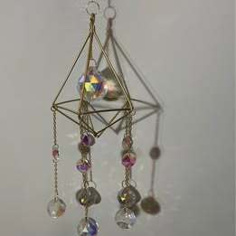 Pretty crystal suncatcher with 5 faceted crystal balls and other crystals hanging from a metal caged pyramid. A larger faceted crystal ball hanging in center of cage. Measures 15" long (including chain) x 4" wide