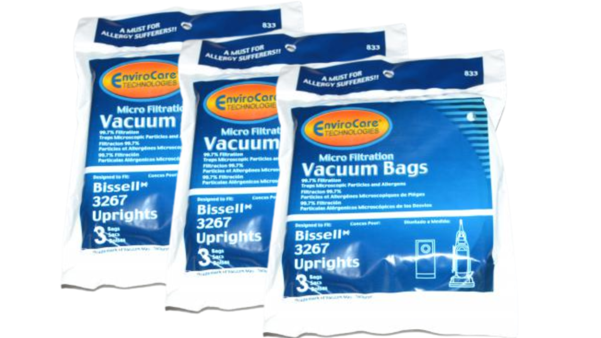 Introducing the Bissell Bag 833 by Envirocare - the perfect solution to maintain a cleaner and healthier home environment. Each pack includes three high-quality micro allergen filtration bags designed specifically for Bissell vacuums.