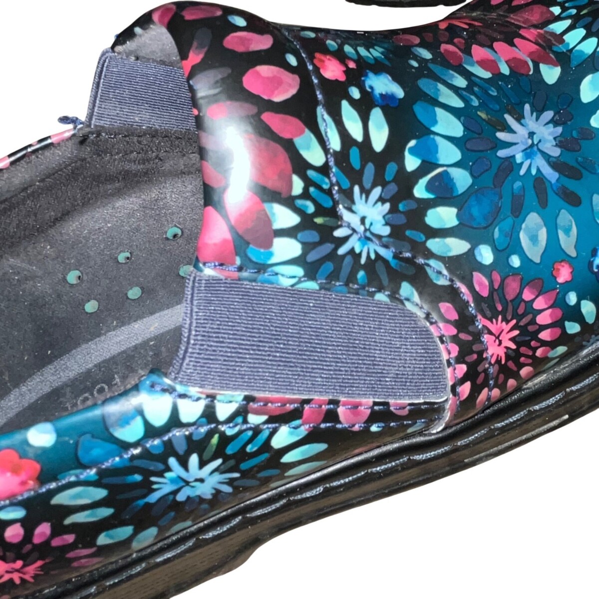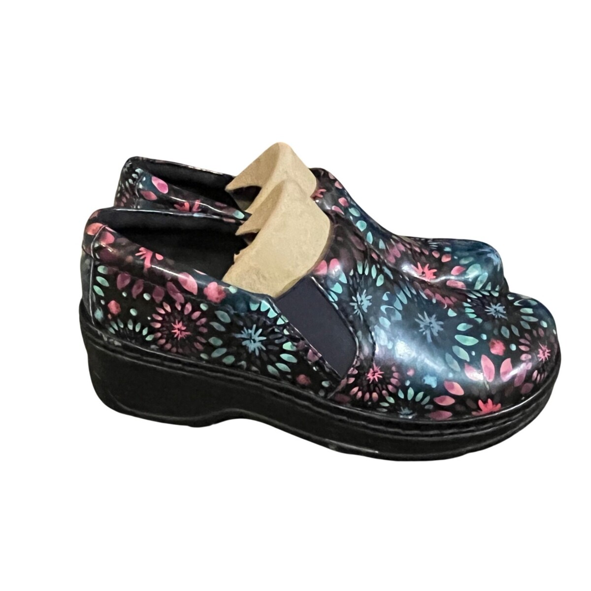 klogs, naples, womens clogs, leather clogs, slip resistant shoes, comfort work shoes, healthcare shoes, nursing shoes, medical shoes, floral clogs, work footwear, supportive shoes, removable insole, size 7.5, womens shoes, used clogs, nonslip clogs