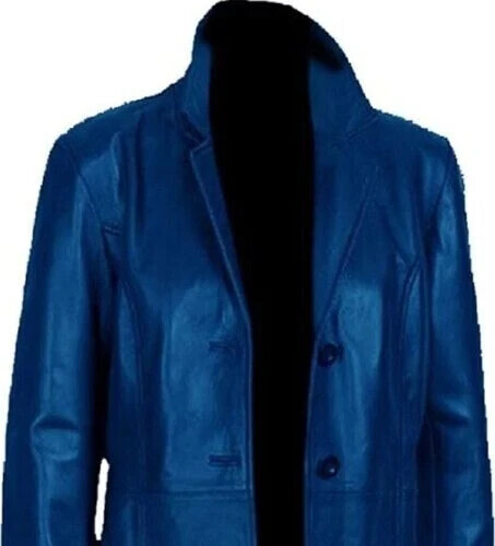 Hombres Gabardina Azul Nuevo Elegante Cuero Hecho a Mano Piel de Cordero Ajus...