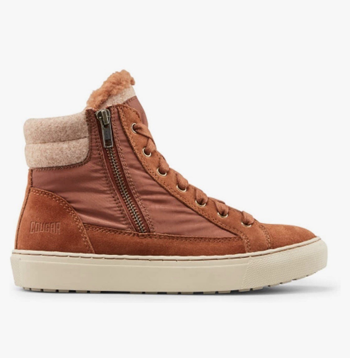 Cougar Shoes Women's Dax Suede/Nylon Winterized SneakersAnkle-height suede and nylon winter sneaker. Rounded toe. Padded felt collar. Zip closure at outer side with lace front. Tonal hardware and self stitching. Rubber outsole.