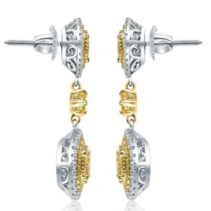 Questi adorabili orecchini alla moda aggiungeranno magia a quel momento speciale! Questi orecchini a goccia penzolanti dispongono di pietre centrali a diamante giallo a fantasia naturale da 1,02 ct a taglio naturale circondato da un doppio alone di diamanti tagli rotondi incolori e gialli in micro pavimentazione con cuscino e taglio a pera diamanti gialli fantasia naturali. Realizzato a mano in oro bicolore 18K. Il peso totale dei carati e di 2,95 carati. Gli orecchini si fissano con chiusura a vite.