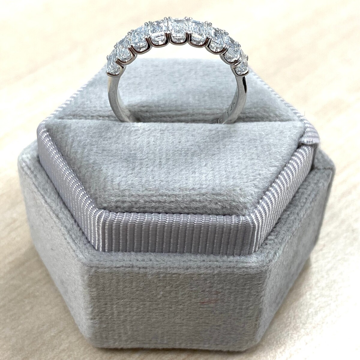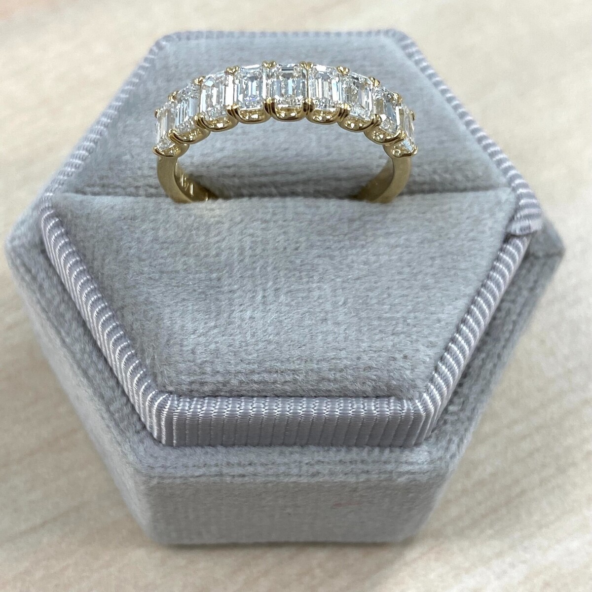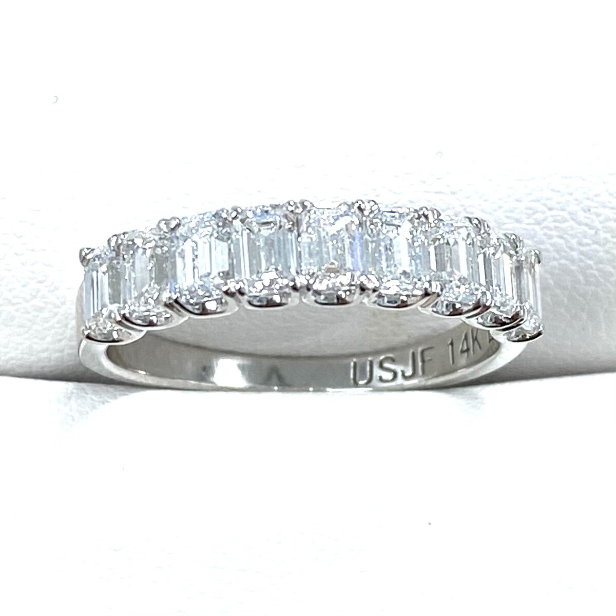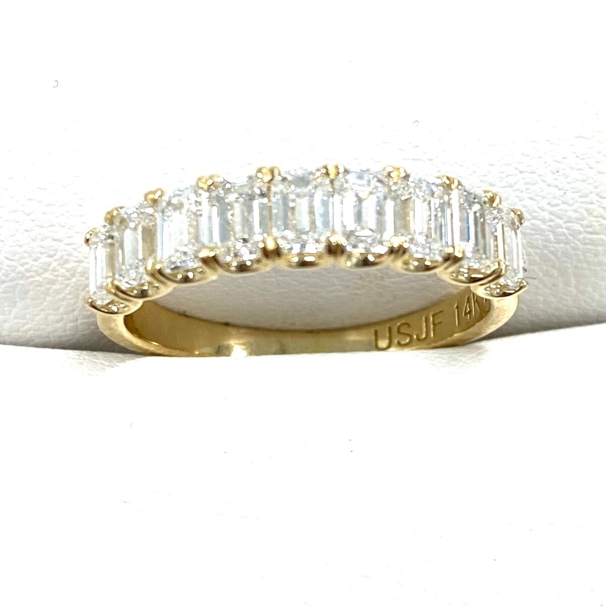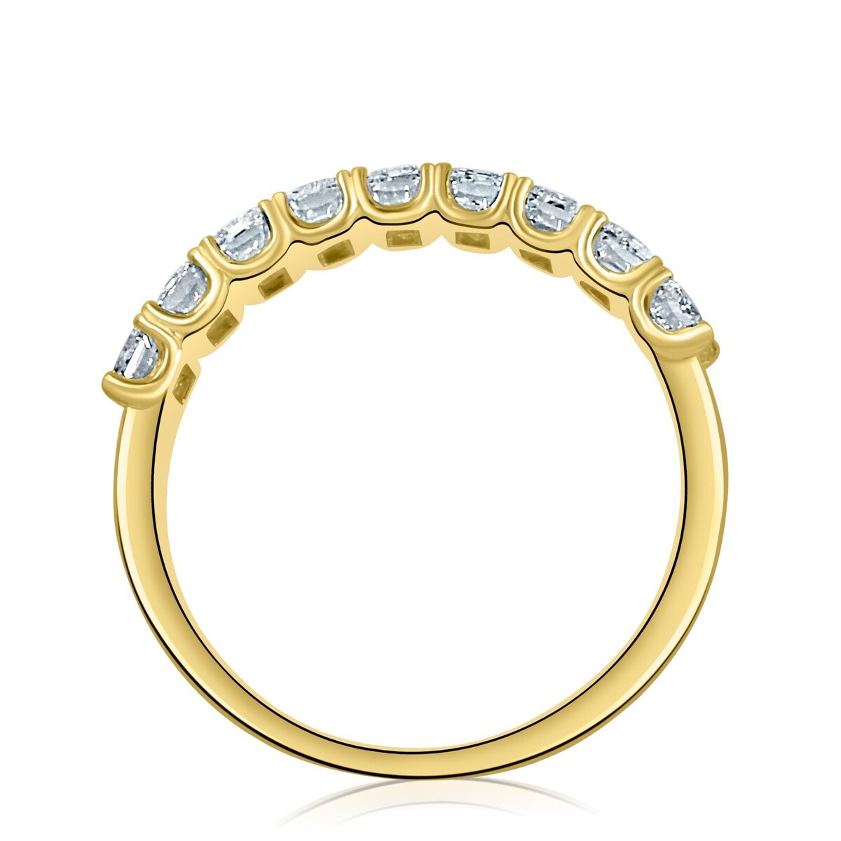 Questa fede nuziale con diamanti con montatura a forma di U e un'espressione abbagliante di amore e impegno. Realizzato in splendido oro massiccio 14k, presenta nove diamanti coltivati ??in laboratorio con taglio smeraldo, ciascuno tenuto saldamente in una classica montatura a griffe. Il peso in carati totale e di 1,75 carati.