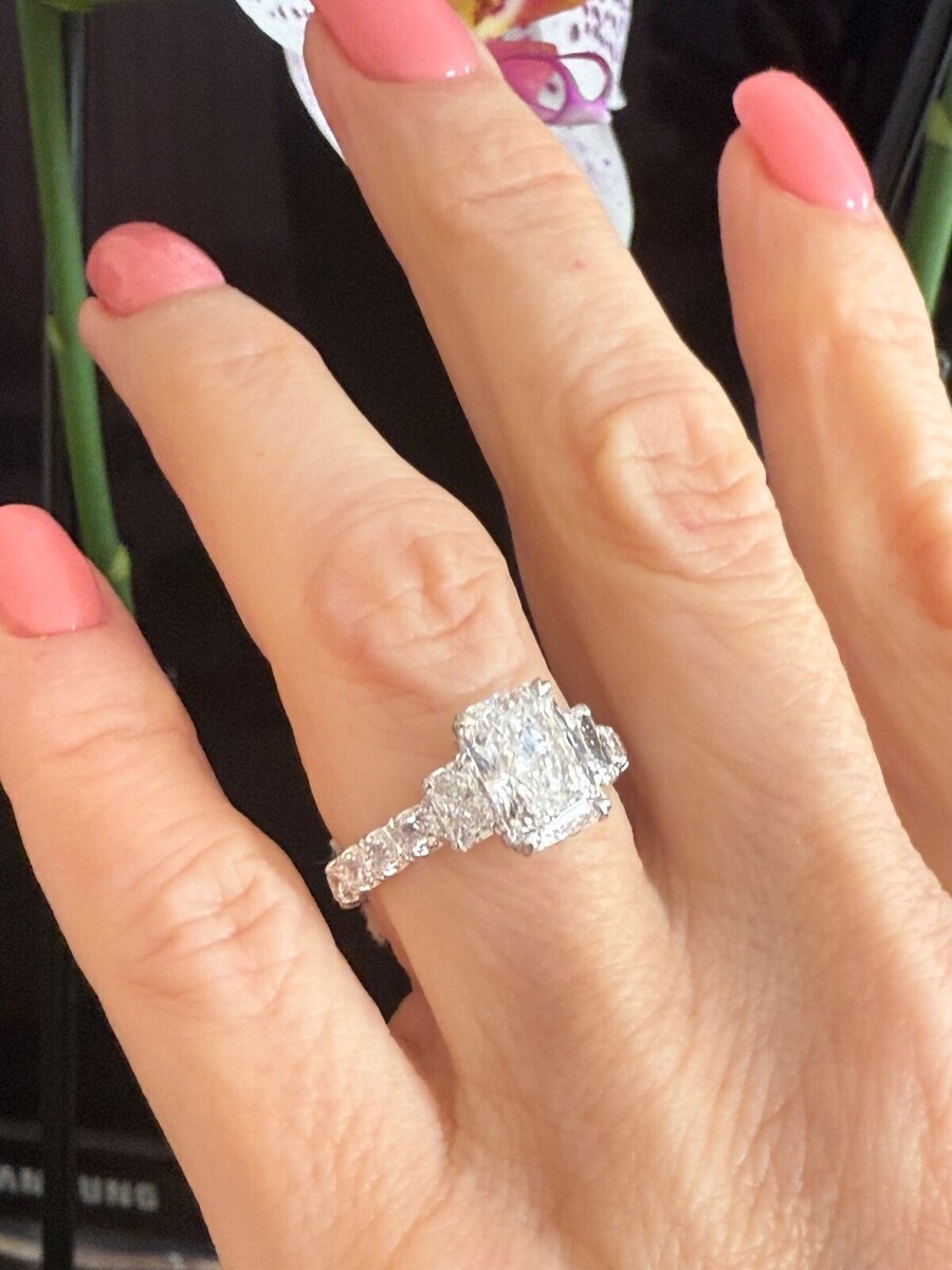 Anello di fidanzamento con diamante coltivato in laboratorio D-VS1 IGI da 2,05 ct con 3 pietre taglio radiante in oro 14 kt