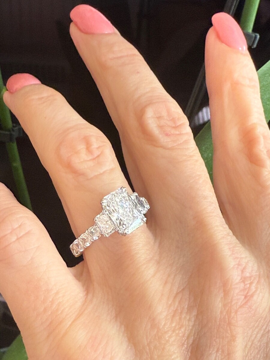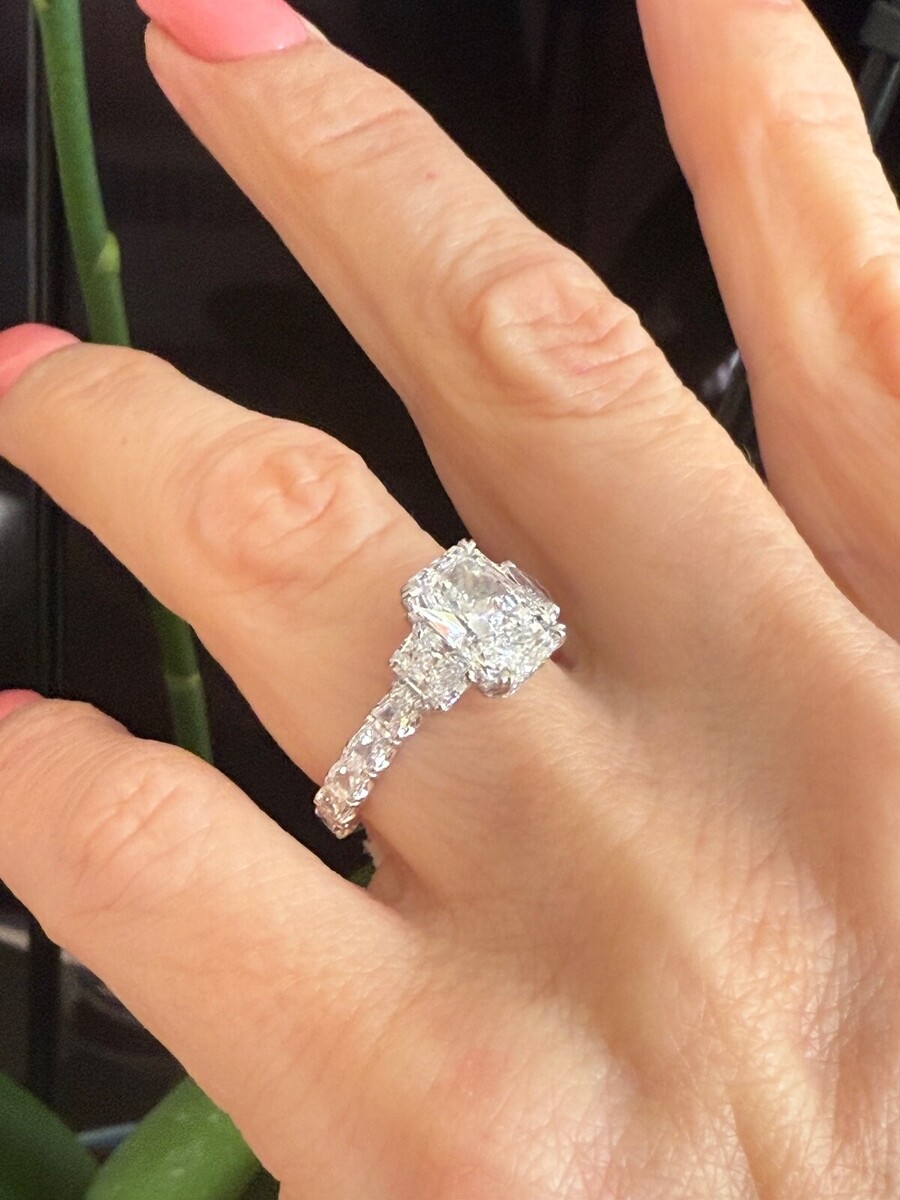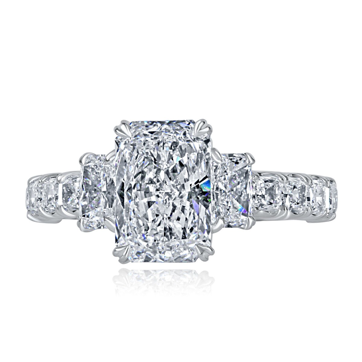 Questo elegante anello di fidanzamento presenta al centro un diamante coltivato in laboratorio con taglio radiante da 2,05 carati, incorniciato da due diamanti con taglio radiante e un alone nascosto per una maggiore sparkle . I diamanti dal taglio brillante continuano lungo la fascia, aggiungendo lucentezza lussuosa e fascino romantico. Rifinito in oro bianco 14k, questo anello senza tempo ammonta a ben 4,03 carati.