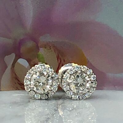 Gli orecchini post-back classici classici scintillanti del Diamond Diamond Center sono perfetti per l'abbigliamento quotidiano. Questi orecchini dispongono di pietre centrali a diamante taglio rotondo da 0,59 carati circondate da un alone di brillanti rotondi incolori in ambientazione di micro pavimenti. Oro bianco 14k a mano. Gli orecchini si fissano con chiusura a vite. Il peso totale dei carati e 0,80.