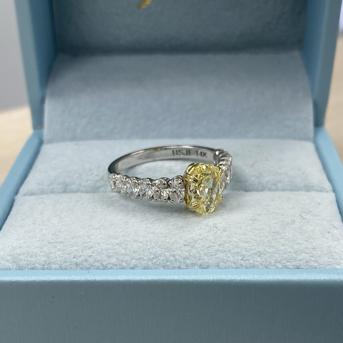 Machen Sie eine mutige Aussage mit diesem exquisiten ovalen brillanten IGI-zertifizierten Diamanten mit gelbem Labor im Zentrum und strahlen lebendige Romantik- und Eleganztone aus! Erganzte dieses Design von Oval Brilliant Cut Lab, kleinere farblose Diamanten an den Seiten und bietet eine außergewohnliche Mischung aus Brillanz und Raffinesse !! Dieser Ring ist in 14 Karat Weißgold mit zarten 18 Karat Gelbgoldakzenten gefertigt und ist eine atemberaubende Wahl für diejenigen, die einzigartige Schonheit und moderner Luxus schatzen !!!