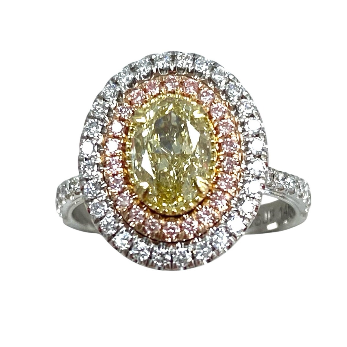 Cette superbe bague de fiancailles met en valeur un diamant a coupe ovale jaune intense en cartes de 1,05-carat, magnifiquement encadre par un double halo de diamants rose et incolore. Fabrique en or multi-tons 14K, le cadre elegant ameliore le dynamisme de la pierre centrale. Les diamants etincelants continuent dans le groupe et la galerie, ajoutant de la brillance sous tous les angles. Un melange parfait de couleur et d'elegance, cette bague est une veritable piece de declaration.