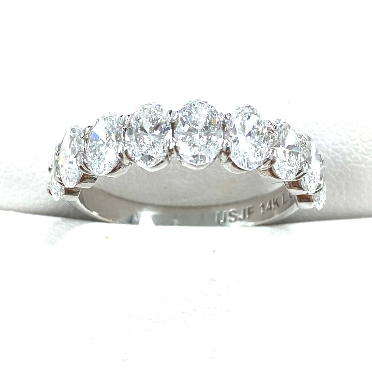 Questa una bellissima fede nuziale con nove diamanti coltivati ??in laboratorio ovale per un totale di 2,25 carati, ambientati in oro bianco da 14k o oro giallo. I diamanti ovali possono offrire un aspetto unico ed elegante rispetto ai diamanti rotondi più tradizionali! Inoltre, i diamanti coltivati ??in laboratorio sono una scelta sostenibile ed etica! Questa combinazione crea uno straordinario gioiello che simboleggia l'amore e l'impegno!