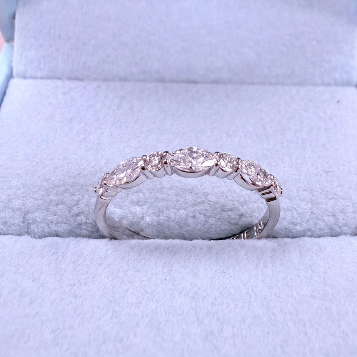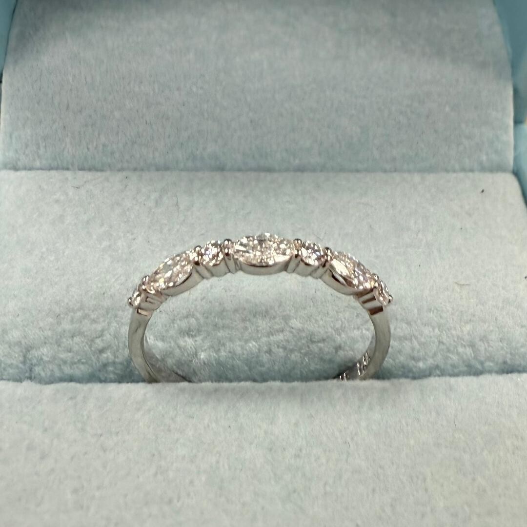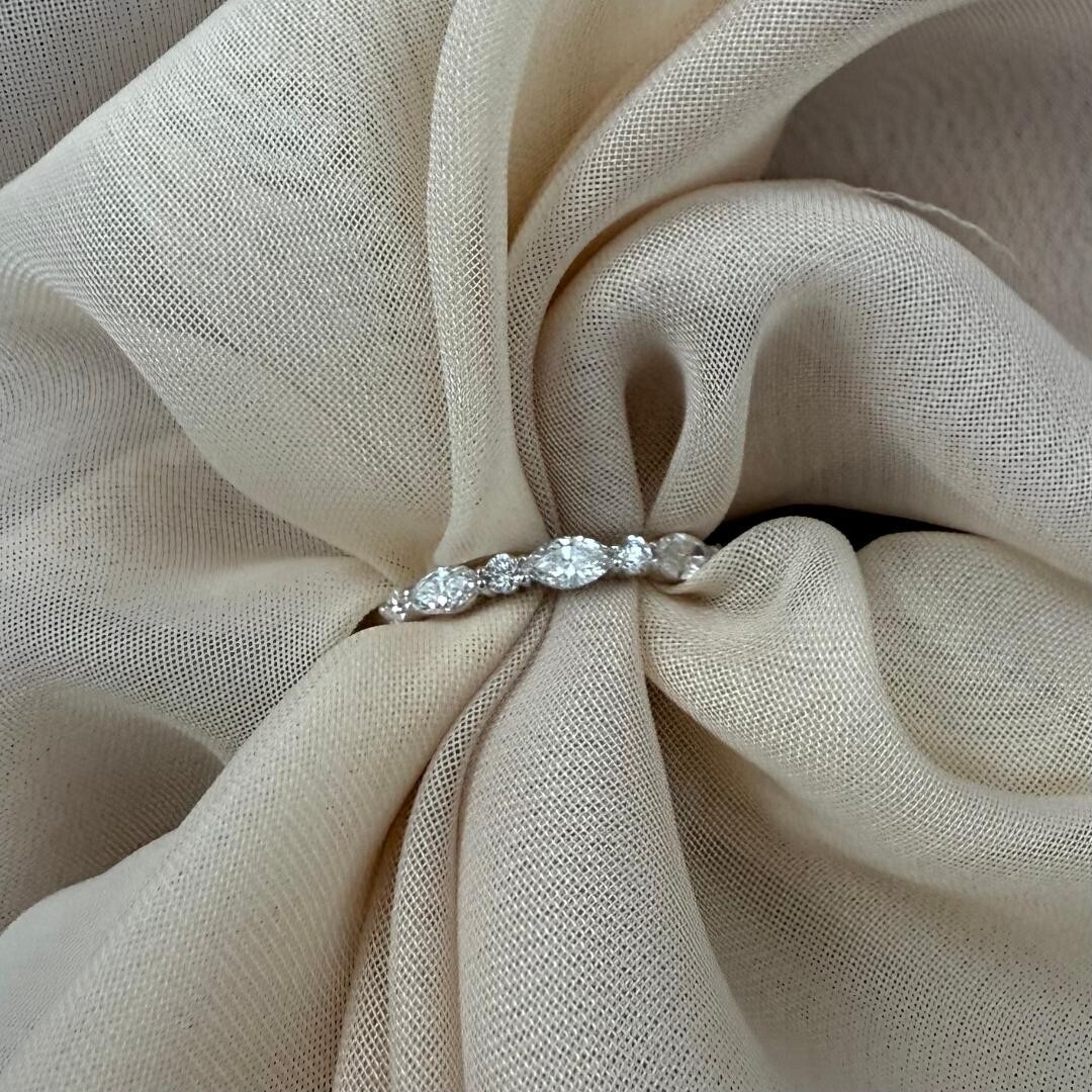 Experimente la elegancia atemporal con nuestra alianza de boda, que presenta un diseño cautivador que alterna diamantes cultivados en laboratorio de talla marquesa y redondos de 0,50 quilates engastados en lujoso oro blanco de 14k. ¡Cada diamante brilla con brillo, añadiendo un toque de sofisticacion a tu día especial!