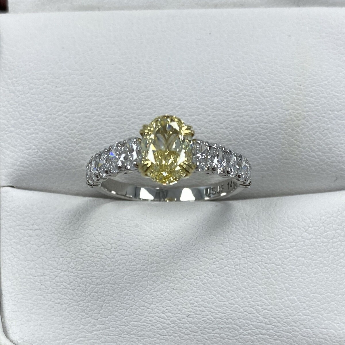 Haga una declaracion audaz con este exquisito diamante amarillo de lujo cultivado en laboratorio con certificacion IGI de talla brillante ovalada en el centro, que irradia tonos vibrantes de romance y elegancia. Complementado con diamantes incoloros mas pequeños cultivados en laboratorio de talla brillante ovalada en los lados, este diseño ofrece una combinacion excepcional de brillo y sofisticacion. Elaborado en oro blanco de 14k, con delicados detalles en oro amarillo de 18k, este anillo es una eleccion impresionante para quienes aprecian la belleza única y el lujo moderno. Todos nuestros productos estan hechos a mano con calidad y cuidado, en el corazon del distrito de los diamantes en la calle 47 de la ciudad de Nueva York. Nuestra dedicacion y compromiso con el buen trabajo y la calid