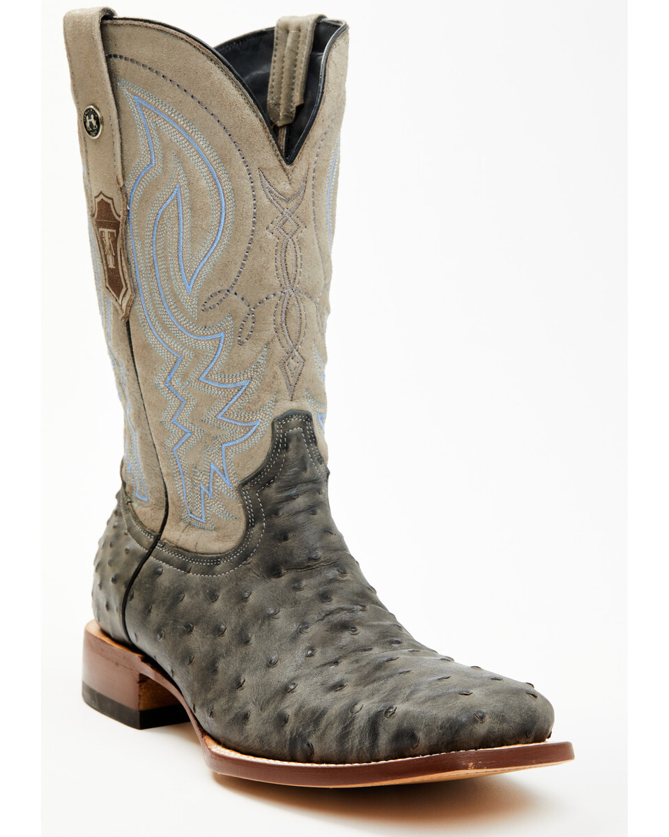 Leather upperBroad square toeDouble-stitched weltPull-on style with pull tabsGray full-quill ostrich print vamp and gray suede shaft with blue western stitchingLeather outsole with rubber heel cap12.5" shaft height1.5" stockman heelPadded insoleImportedStyle: TM205578 H302