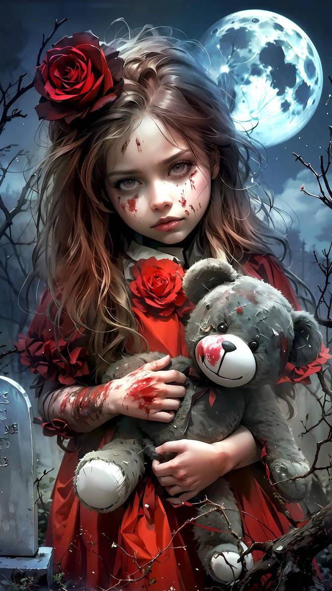 Elira appears as a small, ethereal girl drifting softly between forgotten stones of old cemeteries, her worn teddy bear clutched tightly in her hands. There’s a ghostly beauty about her - an air of sadness mixed with quiet wonder. Spots of red cling to her dress like faded memories of another time, a reminder of the life she once knew.