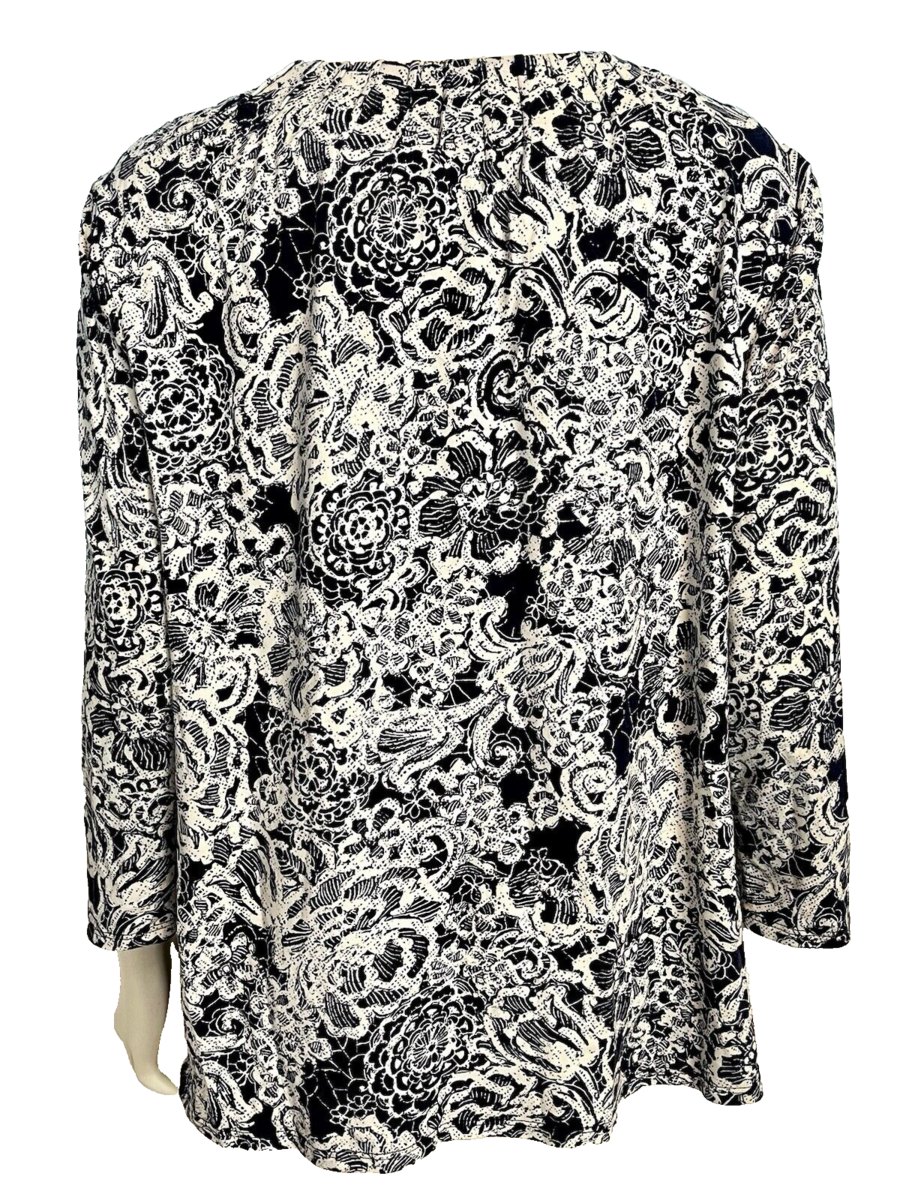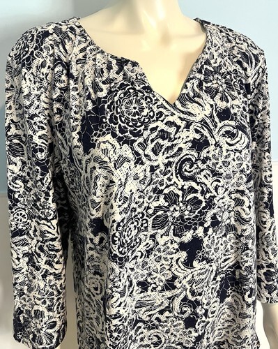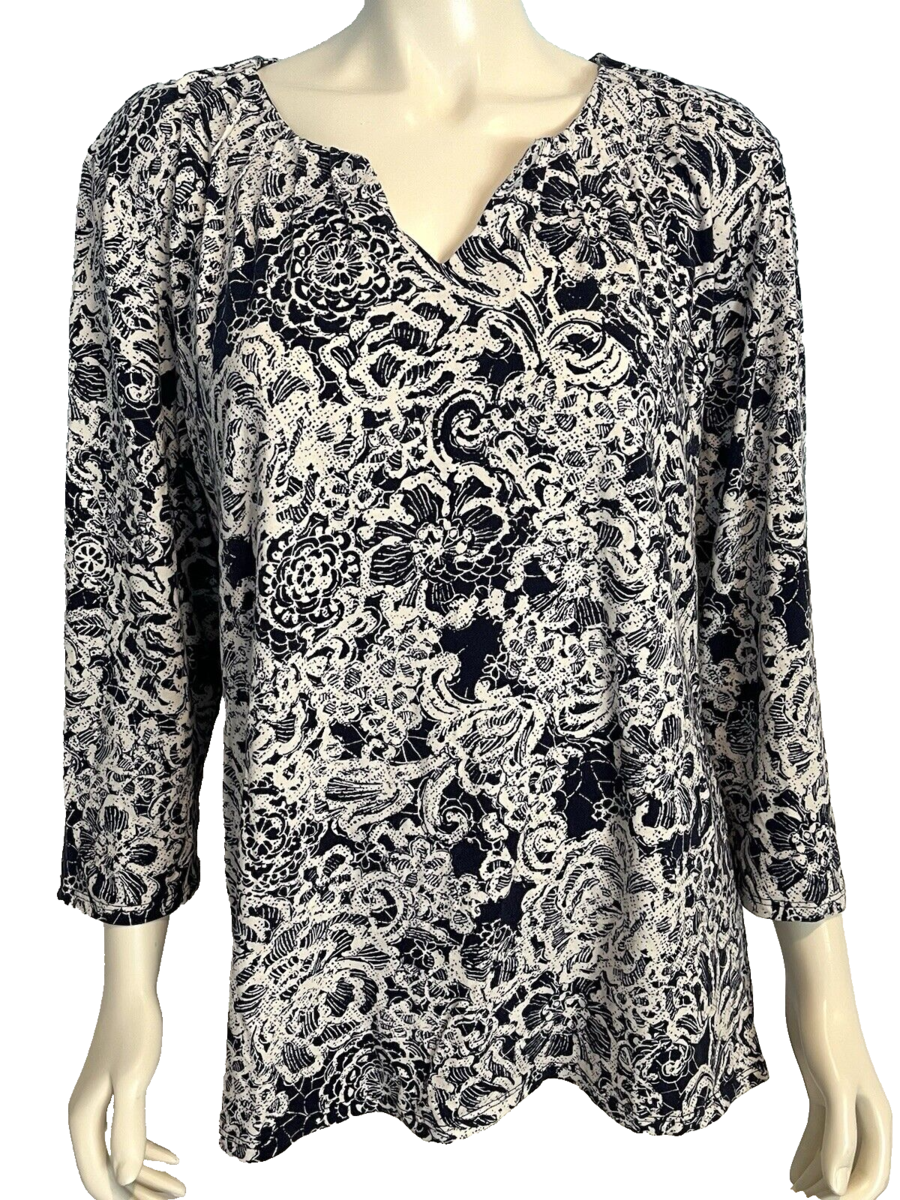 Chico's Navy and Ivory Floral Print V Neck 3/4 Sleeve Top