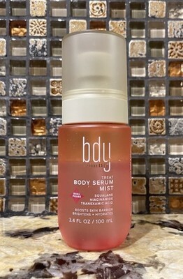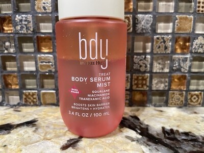 bdy. Mini Brightening Dual Phase Body Serum Mist with Niacinamide + Squalane is a silky, non-greasy serum mist, perfect for on-the-go dewy skin. 3.4oz bottle travel size