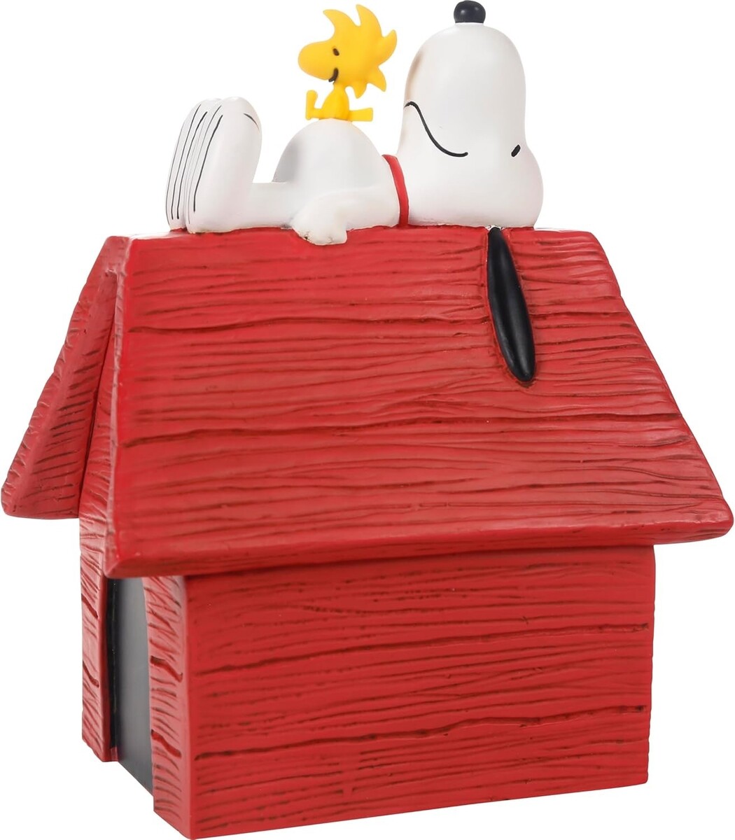 Snoopy?s imagination takes him to great heights, as far as fighting the bad guys in his WWI fighter jet which looks remarkably like his red doghouse. This clever gift features Snoopy taking a snooze atop his home, dreaming of the day he catches his nemesis the Red Baron once and for all. This fun shadow box shows Snoopy?s vision within, a fun way to depict the popular Peanuts theme. Fans of Snoopy, and Peanuts collectible gifts in general, will appreciate this colorful shadowbox. Give as a thoughtful holiday gift, birthday present, or ?just because? gift to anyone who loves Charlie Brown?s beagle. Measuring approximately 5.5? H, this colorful shadowbox is carefully crafted of resin and is expertly hand-painted.