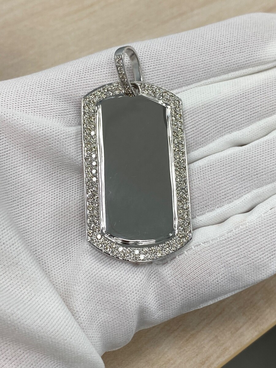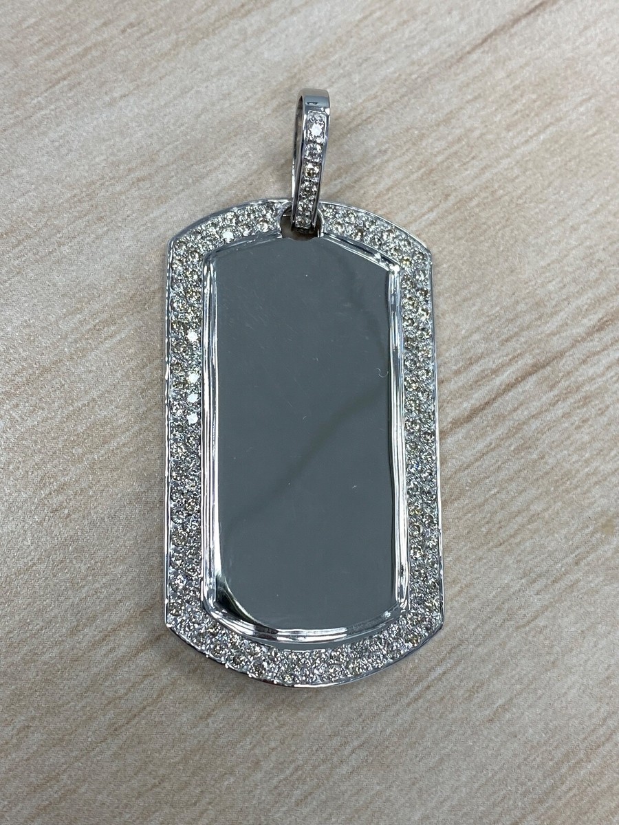 Impresionante colgante de etiquetas para perros muestra 1.90 quilates de diamantes de corte redondo pavoneo magistralmente en un hermoso oro blanco solido de 14 quilates.