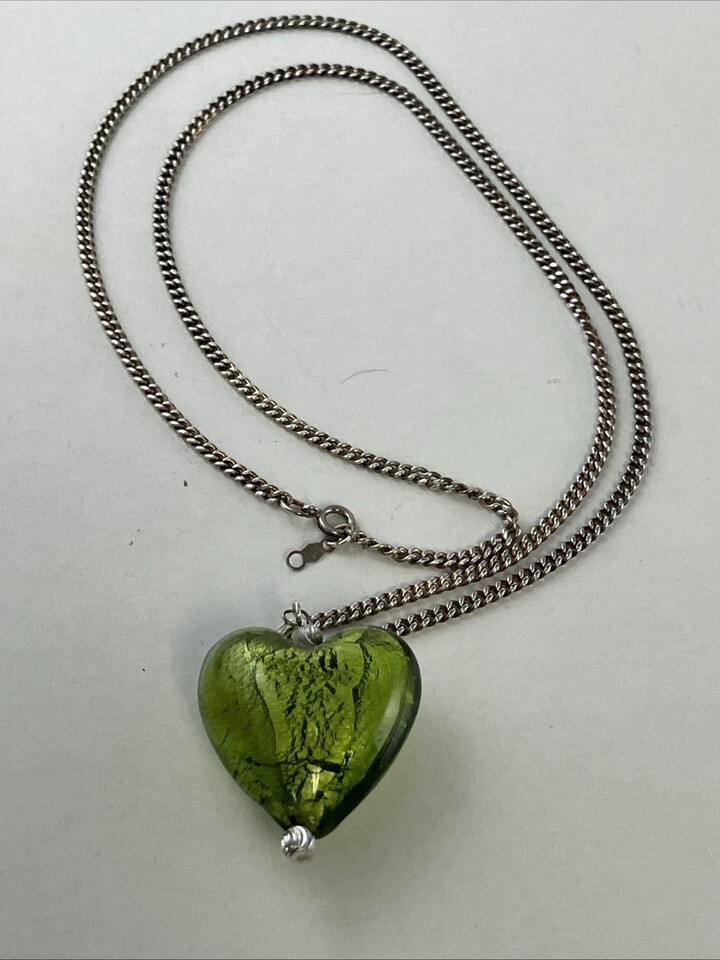 We noted the number of similar Murano/Italian lime green heart pendants and thought we would pair it with a 24 inch sterling silver necklace to make it stand out.