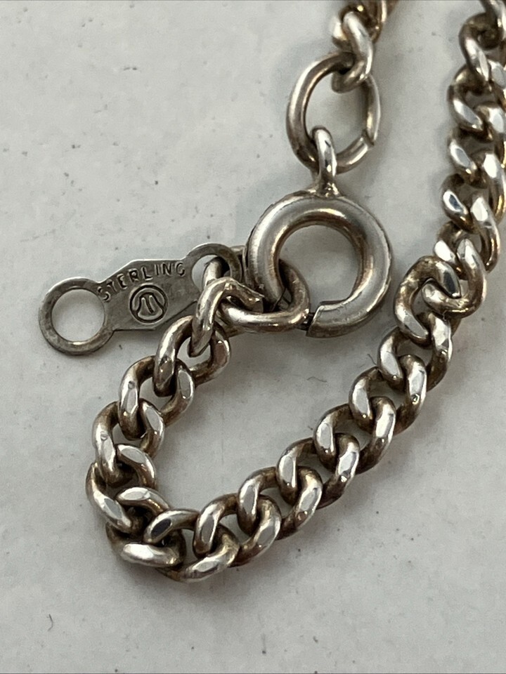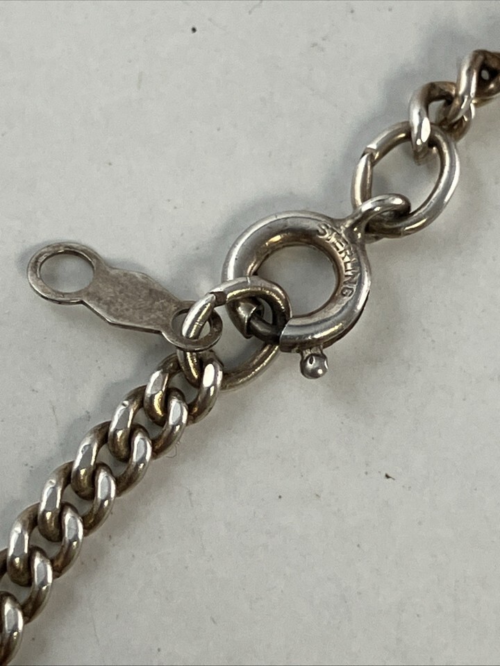 The sterling silver necklace is 24 inches long and marked in two places as shown. The pendant?s bail is also marked 925 (sterling silver purity).