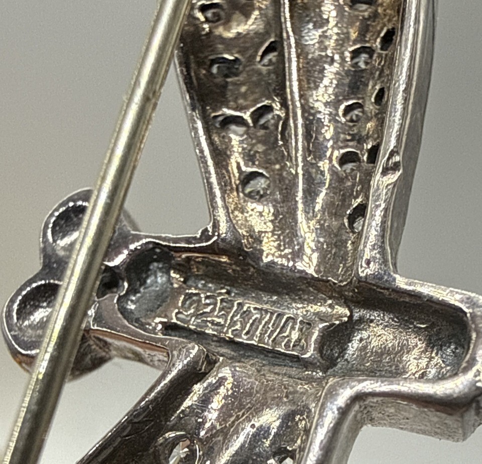 Measures approximately two inches across and two inches long. Weighs 9.9 grams of sterling silver and marcasite.