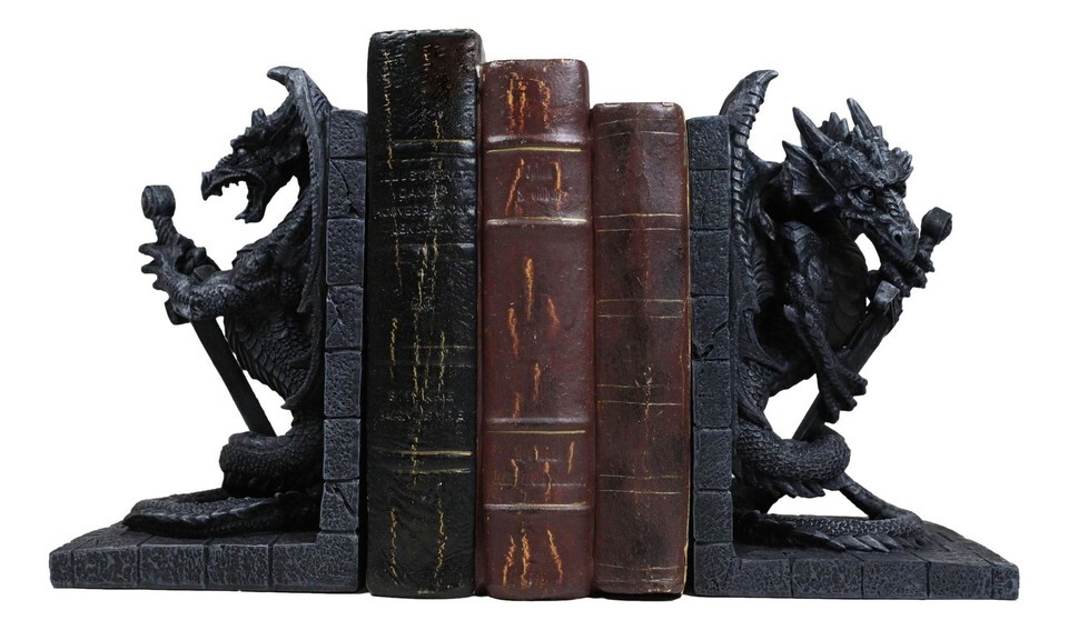 ? The bookends depicts Two Dragon Holding Sword standing guard on each end of the booken