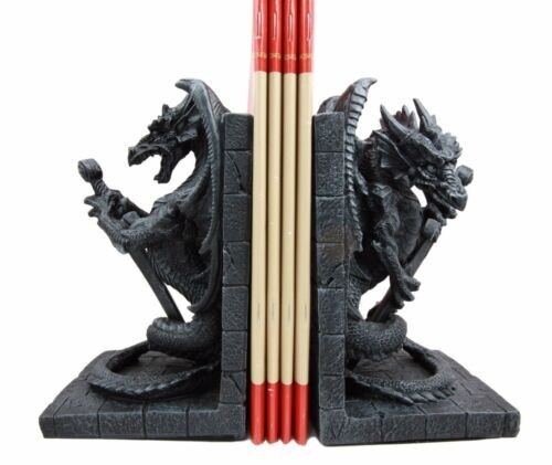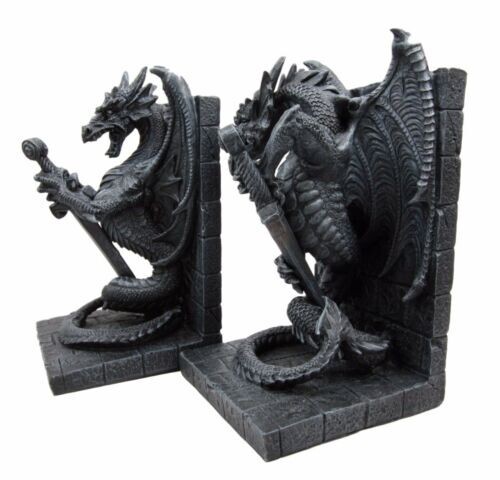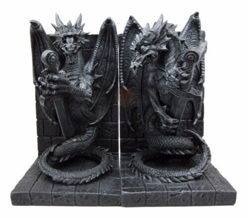 Gothic Excalibur Sword Guardian Dragon Bookend Set of Two Figurine Faux Stone