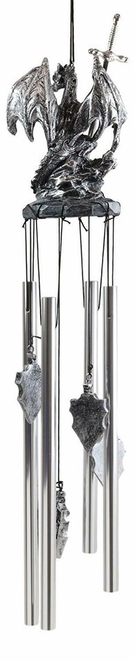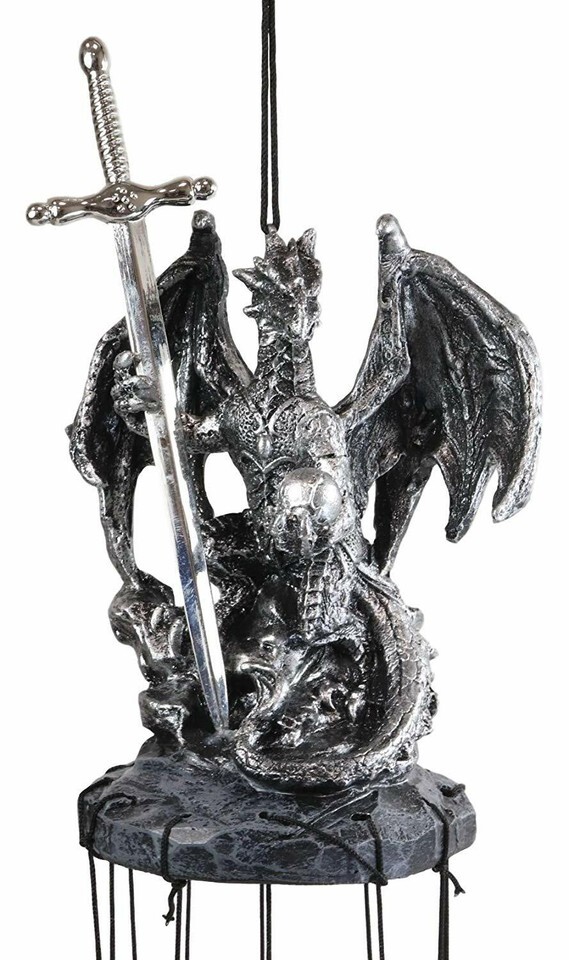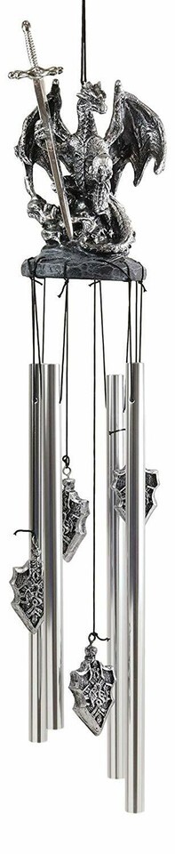 ? A Silver metallic Dragon stands on a rock stump, holding an Excalibur sword and an orb. Connected to the sculptural crown of the wind chime are aluminum rods and ornamental sculptures of dragon's armor piercing arrow heads. The wind chime is a perfect gift for your loved ones who love dungeons and dragons, myths and magic, gothic alchemy themed decors.
