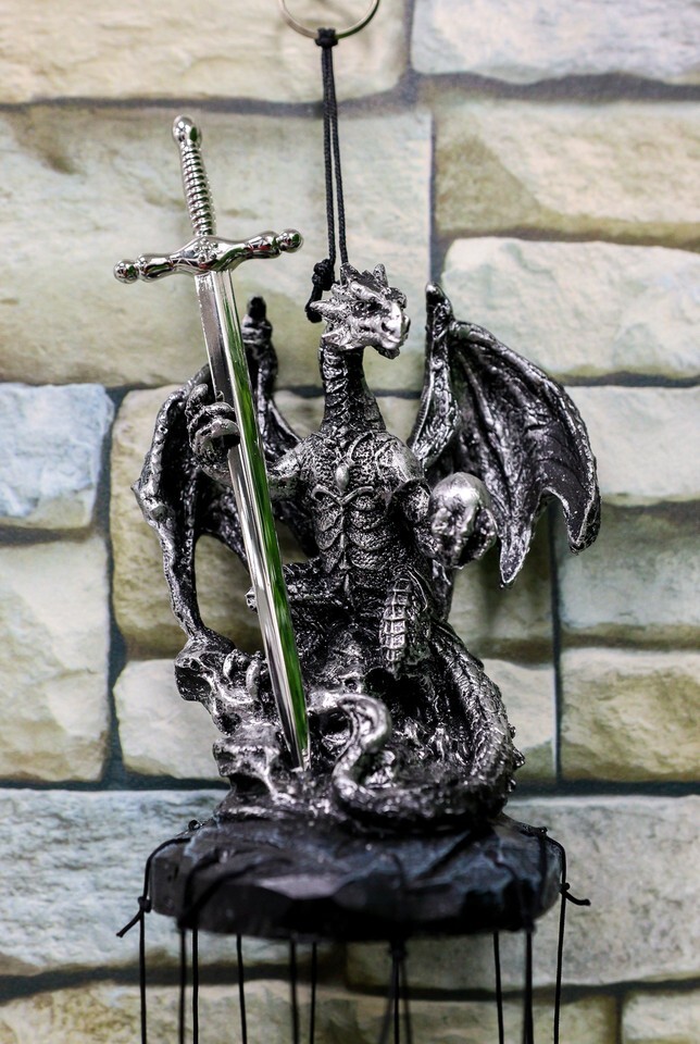 Ebros Medieval Silver Dragon Holding Excalibur Sword And Orb Figurine Wind Chime Decor