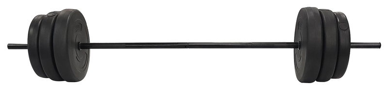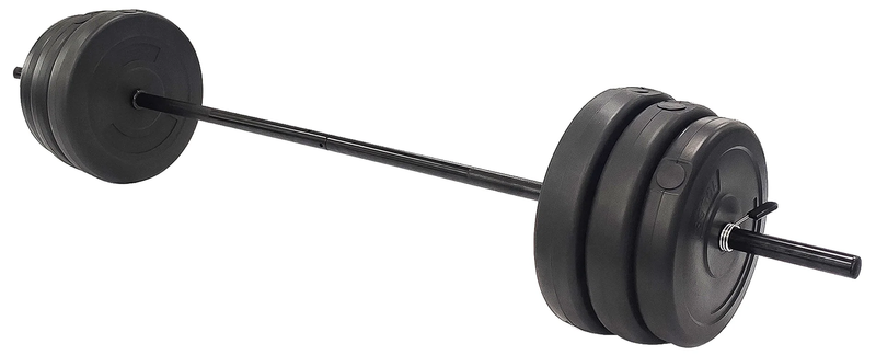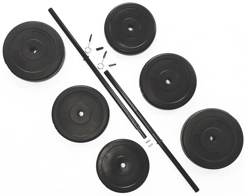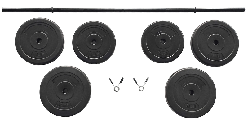 Steel barbell and weights allow you to build and maintain muscle through a wide range of strengthening workouts 100-pound set includes (2) 25-pound, (2) 15-pound plates, and (2) 10-pound weights, (1) 2-piece, 5-foot steel bar, and 2 spring-clip collars Weights are designed with durable vinyl-coated cement-filled plates and a sturdy steel bar for easy lifting Great for resistance training including squats, bench press, deadlifts, and more; Ideal for anyone interested in fitness, from beginner to pro Spring-clip collars secure the weights in place, preventing slipping and sliding and minimizing accidents or injuries Suitable for at-home, gym, and even the office Color: Black Weight: 100 pounds