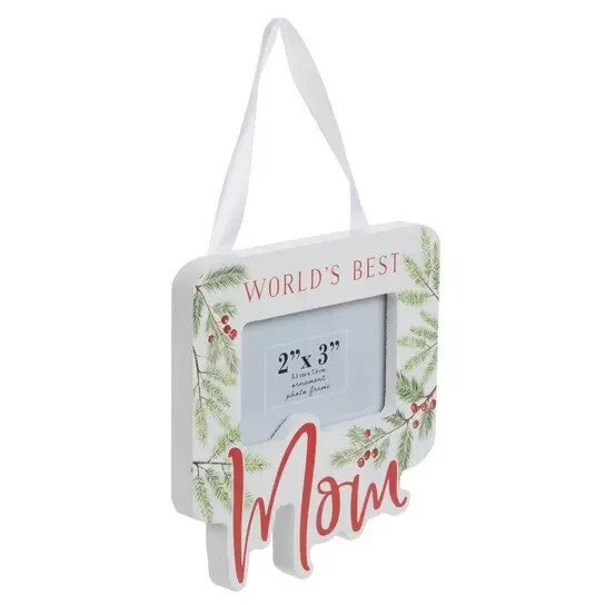 Add some meaningful decorations to your tree with this World's Best Mom Photo Frame Ornament. This MDF ornament features a white frame decorated with pine needles and red berries. In the center is a small spot for a picture that is covered by a glass panel. Slip a picture of you and your mom into the frame, and then use the ribbon to hang it on your Christmas tree!