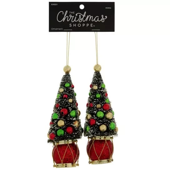 Accent your holiday tree with these Christmas Tree With Drum Base Ornaments! Each ornament is designed to look like a mini Christmas tree with a metallic drum base. The tree is decorated with white flocking and shiny beads that give it a unique look. Display them with their golden strings for a festive look!