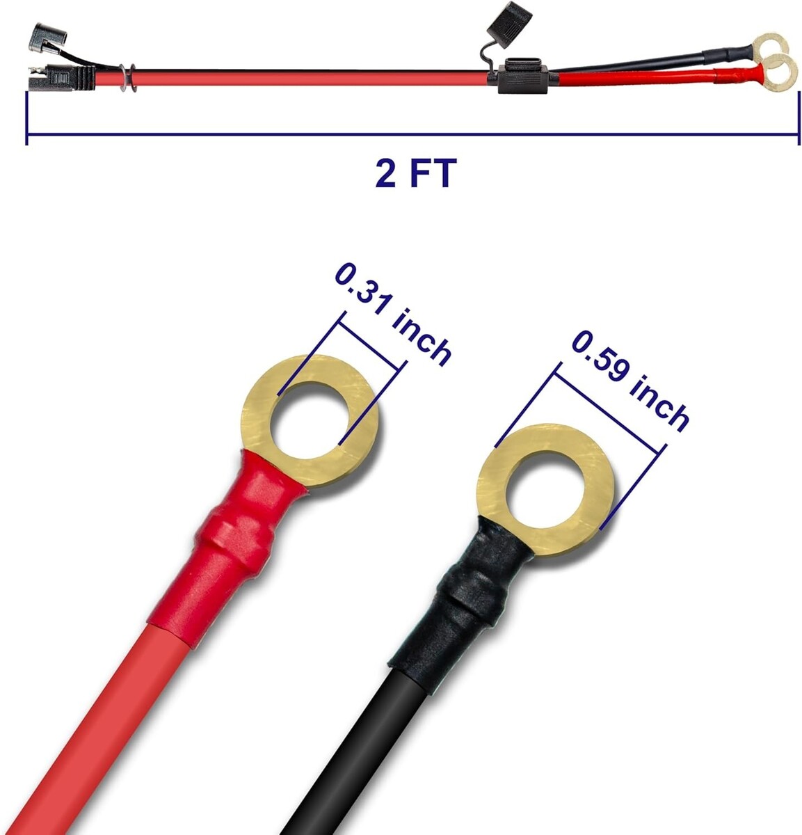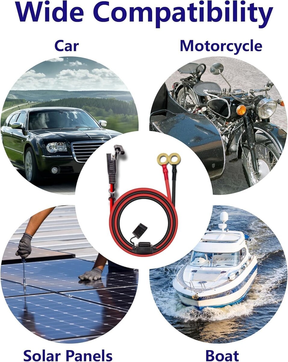 Includes 10AWG 2FT SAE to O-Ring Terminal Cable with a 15A 20A fuse, suitable for cars, motorcycles, solar panels, and more