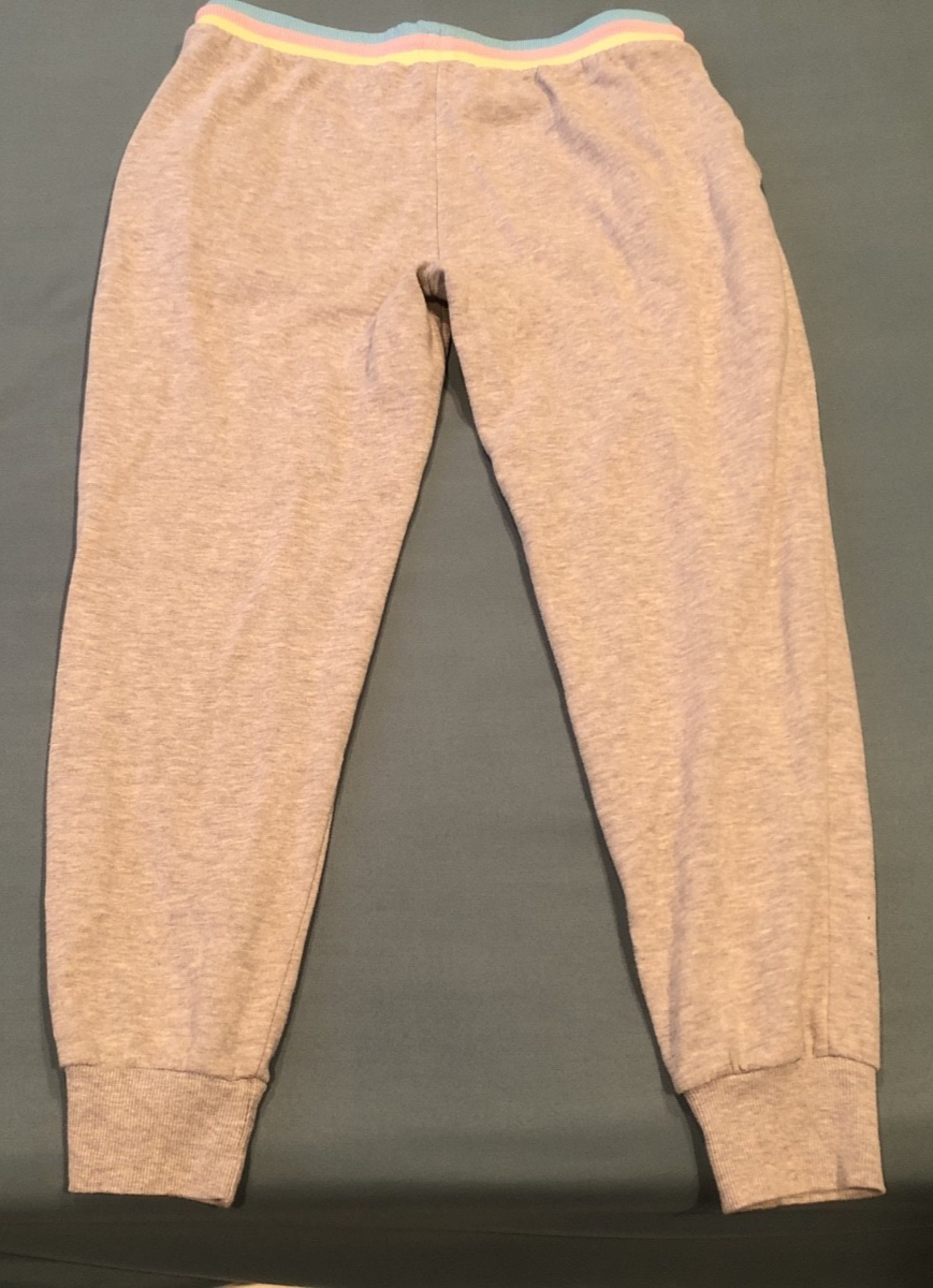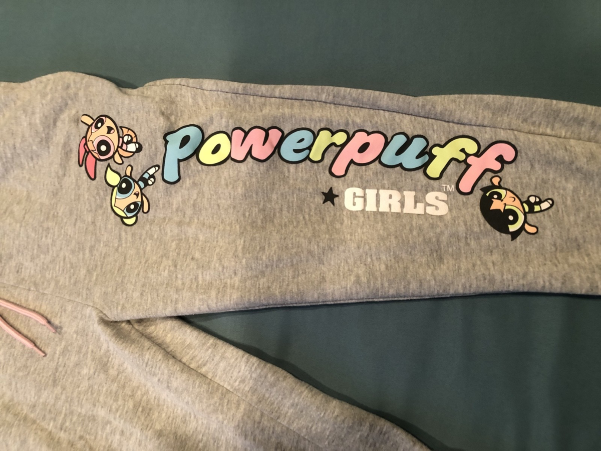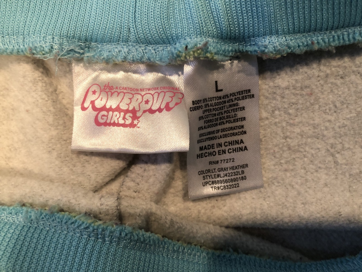 CARTOON NETWORK POWERPUFFS GIRLS SWEATPANTS (L). COMES FROM SMOKE FREE HOME. FREE SHIPPING. MACHINE WASHABLE. TIE CLOSURE WITH ELASTIC WAISTBAND. MADE IN CHINA. 55% COTTON 45% POLYESTER.