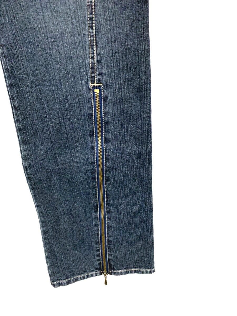 New without tags (NWOT) DKNY Jeans sample denim, 2003, possibly one-of-a-kind. Rare sample cut with 3-button fly, low rise, straight legs, and zippers from hem to knee. Marked 32x35. Never worn, clean, excellent condition.