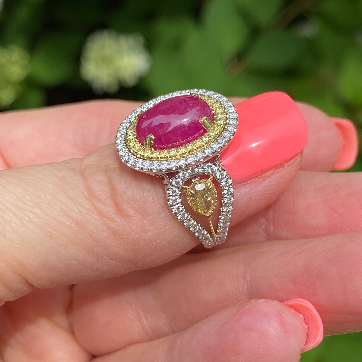 Cette etonnante bague presente un rubis double cabochon de forme ovale, non chauffe, rouge violace certifie GIA de 4,91 carats au centre, entoure d'un double halo de diamants ronds jaunes et incolores. Le rubis central est flanque de deux diamants en forme de poire. Ces diamants sont decrits comme « naturels de fantaisie », ce qui indique qu'ils possedent des proprietes de couleur uniques et precieuses ! La bague est en or 18 carats et presente un design bicolore qui combine differentes couleurs d'or pour un look sophistique. Nos produits sont tous fabriques a la main avec de la qualite et des soins, au c?ur du district de Diamond sur la 47th Street a New York. Notre devouement et notre engagement envers le travail et la qualite fins depassent tous les autres. Etant donne que tous nos prod