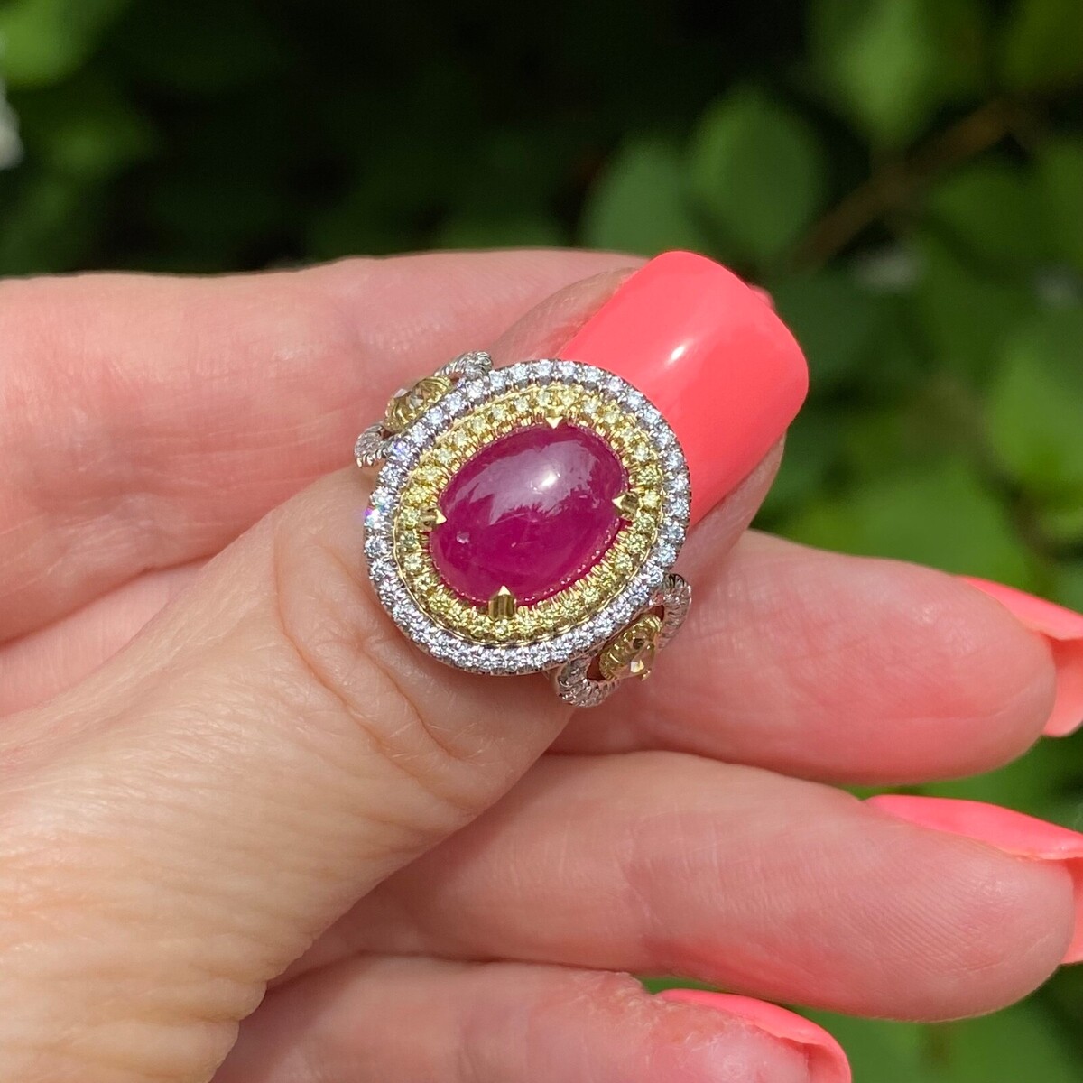 Cette etonnante bague presente un rubis double cabochon de forme ovale, non chauffe, rouge violace certifie GIA de 4,91 carats au centre, entoure d'un double halo de diamants ronds jaunes et incolores. Le rubis central est flanque de deux diamants en forme de poire. Ces diamants sont decrits comme « naturels de fantaisie », ce qui indique qu'ils possedent des proprietes de couleur uniques et precieuses ! La bague est en or 18 carats et presente un design bicolore qui combine differentes couleurs d'or pour un look sophistique.