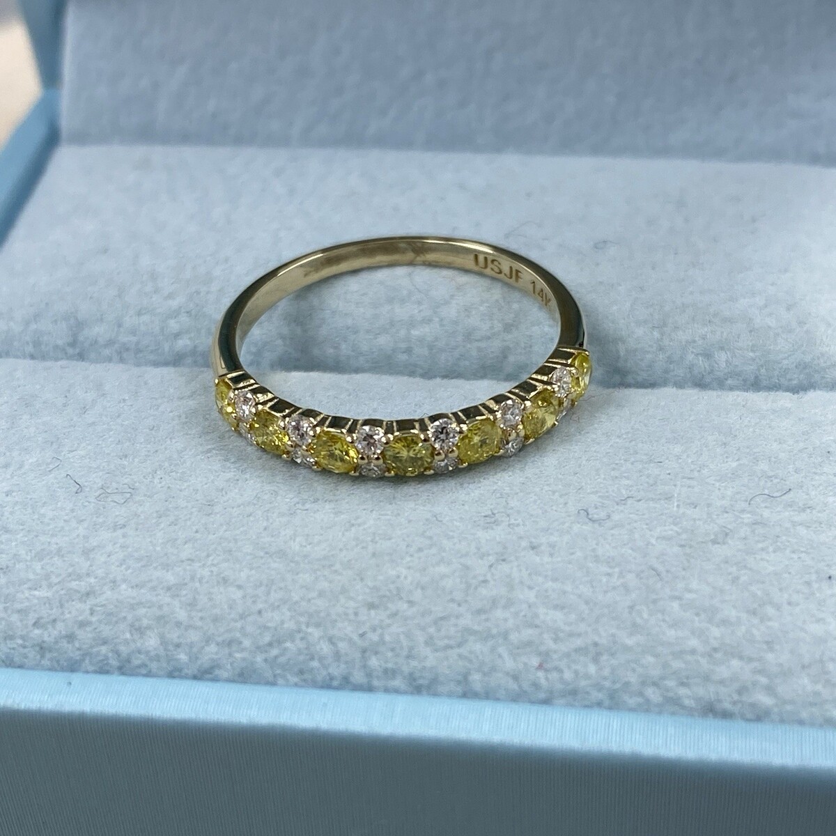 Este anillo de bodas presenta un diseño alternativo de diamantes mejorados de color blanco y amarillo que son de punta con un peso total de diamantes de 0.50 quilates. Hecho a mano en oro amarillo de 14 quilates y completado con un alto acabado de esmalte para un efecto brillante. El ancho es de 3.2 mm. El ancho de la vastago es de 1.6 mm.