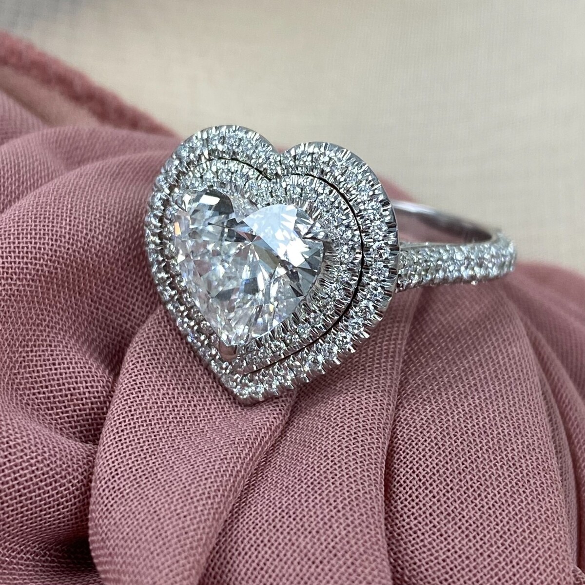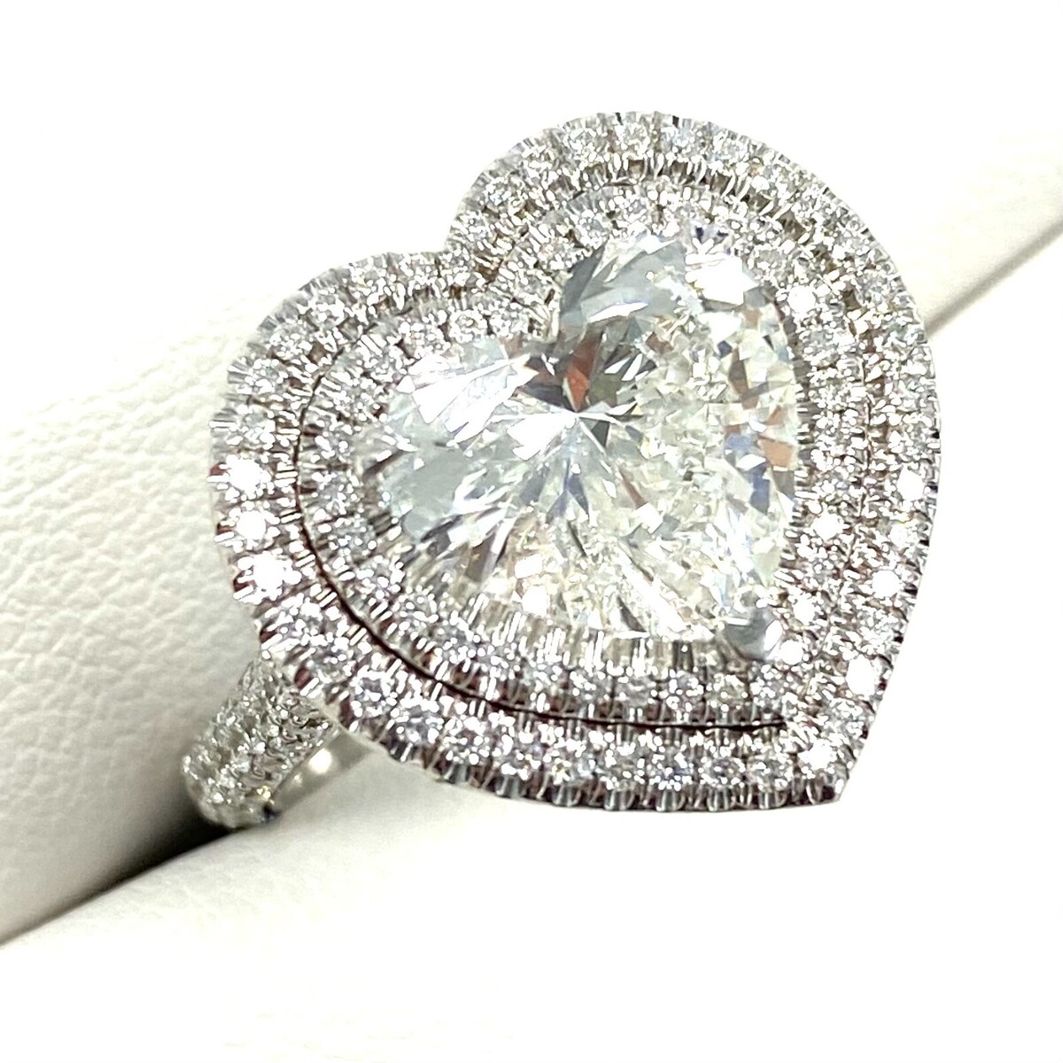 Erhohen Sie Ihre Liebesgeschichte mit unserem atemberaubenden Diamant-Verlobungsring mit einem atemberaubenden 2,85 Karat F-VS1 IGI-zertifizierten, im Labor gezüchteten Diamanten in Herzform, umgeben von einem faszinierenden doppelten Heiligenschein aus im Labor gezüchteten Diamanten im Rundschliff, der jedem Winkel Brillanz und Glamour verleiht.