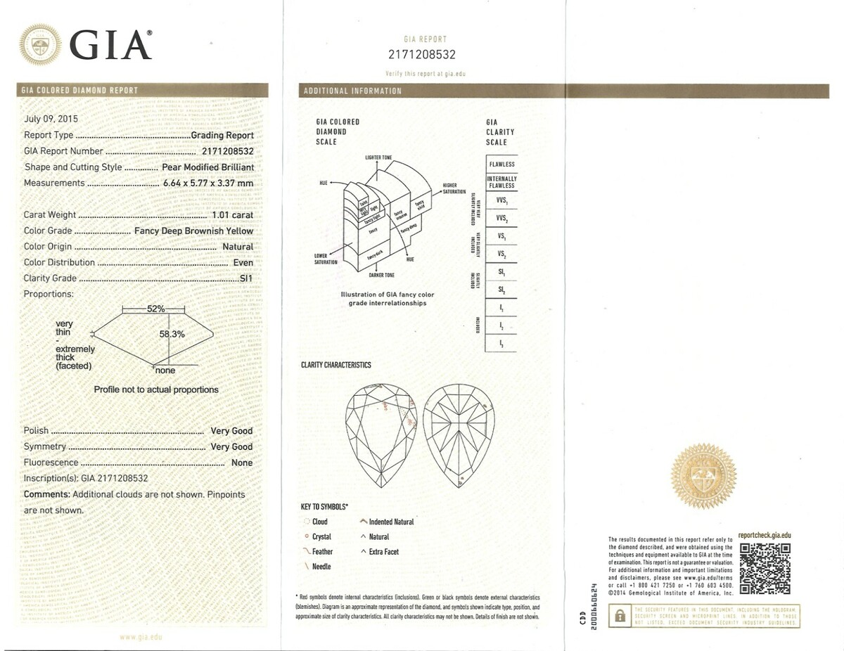 L'eblouissante bague de fiancailles en diamant unique en son genre presente un diamant central naturel fantaisie taille brillant poire jaune brunatre fonce de 1,01 carat certifie GIA (numero de rapport 2171208532), entoure d'un double halo de diamants ronds jaunes et incolores scintillants encadre elegamment le diamant central. Des diamants supplementaires bordent les cotes de la tige et de la galerie, completant l'aspect brillant de la bague spectaculaire. Fabrique a la main en or bicolore 18 carats et complete par une finition hautement polie. Le poids total en carats est de 1,78 carats.