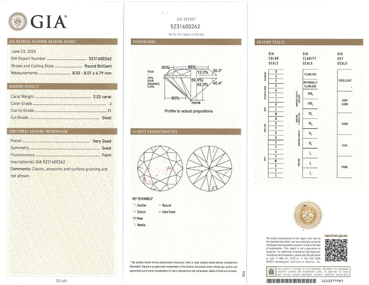 Der umwerfende Diamant-Verlobungsring besteht aus einem 2,02 Karat GIA-zertifizierten runden I1-J-Diamanten im Brillantschliff in der Mitte, der über einer Schiene aus 18 Karat Weißgold gefasst ist. Der Schaft ist mit Akzenten aus farblosen runden Diamanten im Brillantschliff gesaumt, die den funkelnden Reiz dieses wunderschonen Rings vervollstandigen. Das Gesamtkaratgewicht betragt 3,02 Karat. Dies ist ein tolles Geschenk für Ihre Liebste!