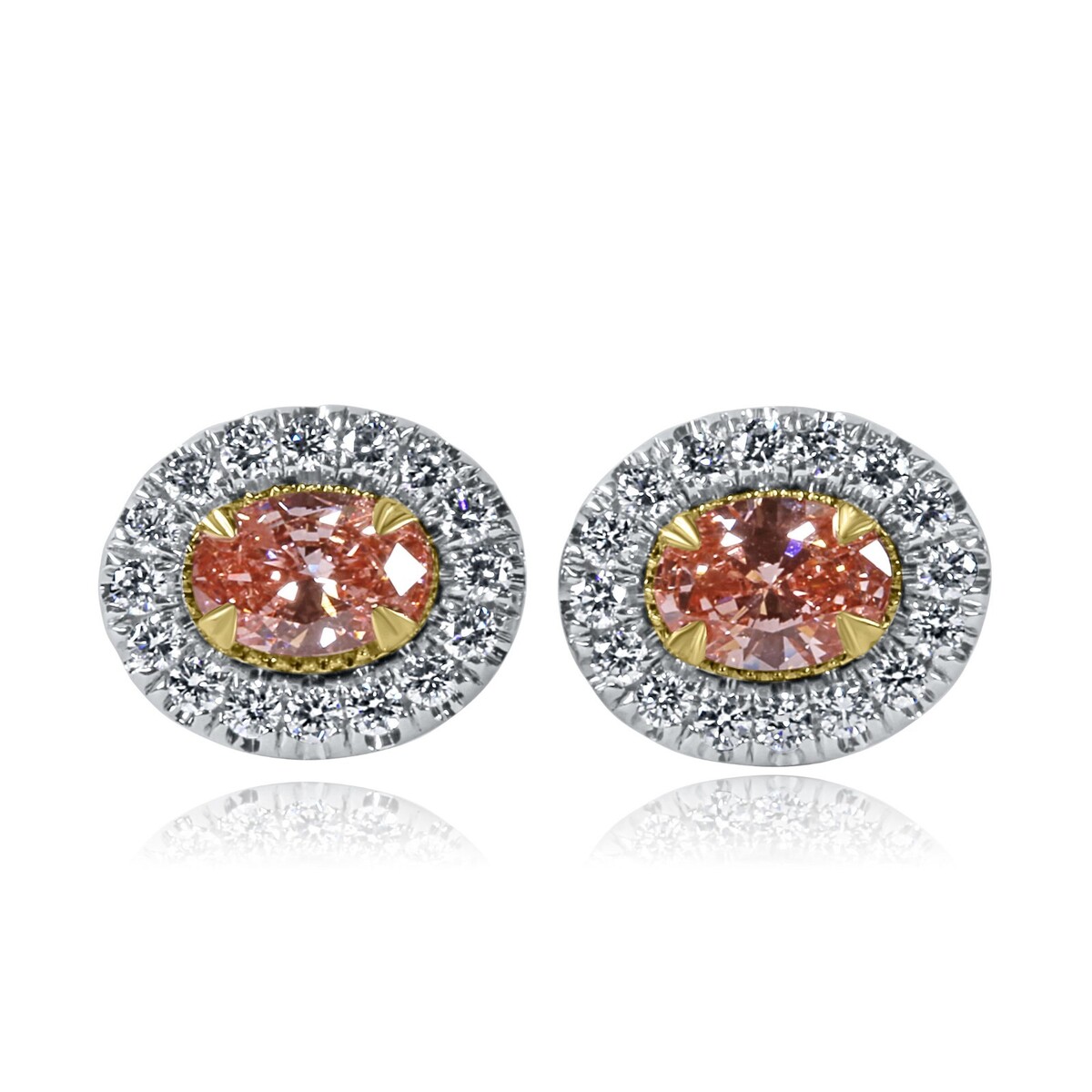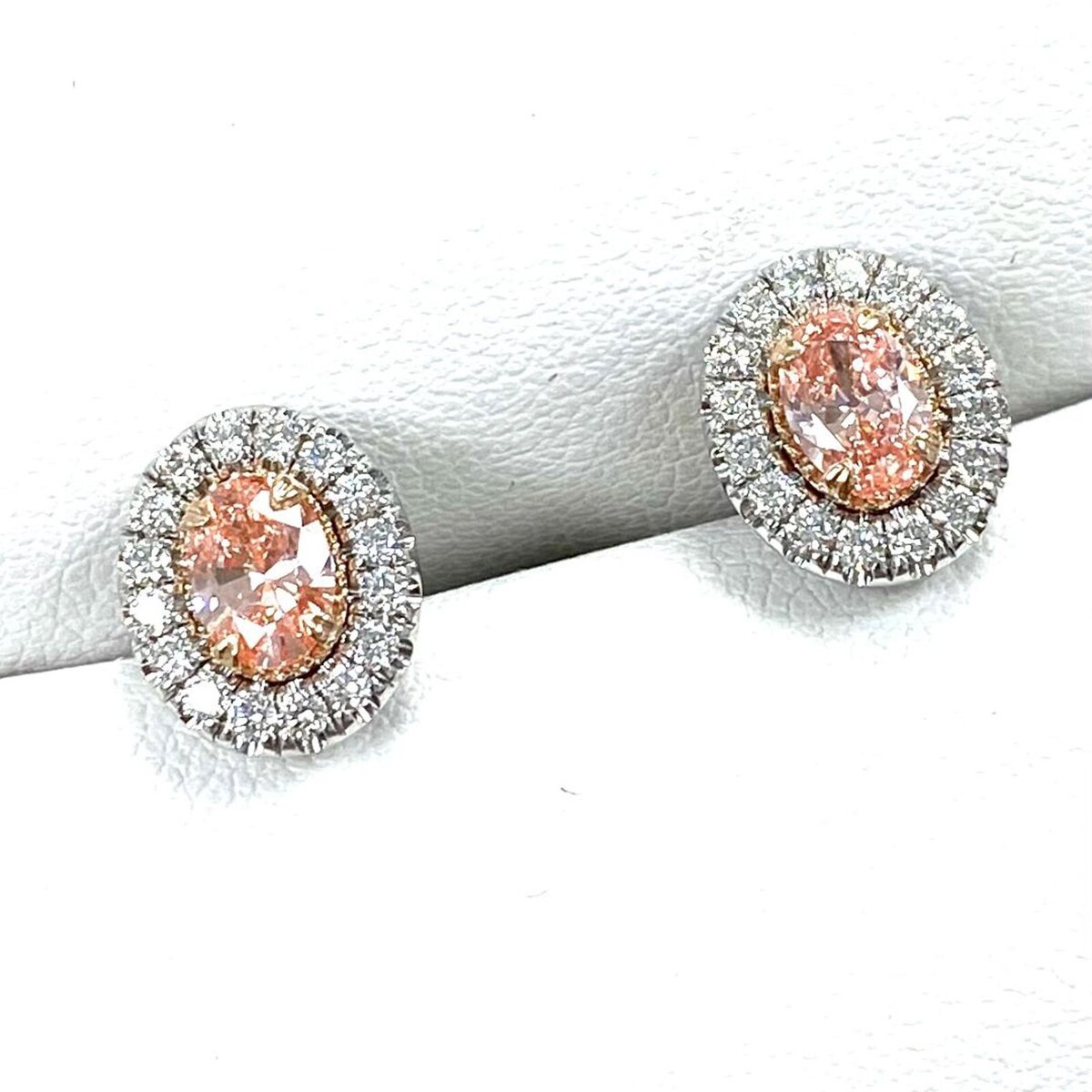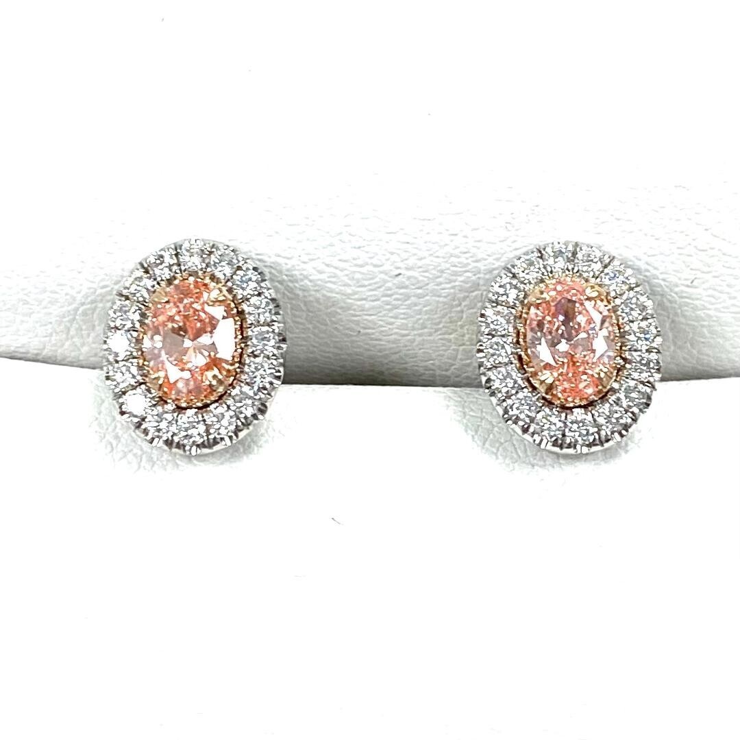 Questi fantastici orecchini presentano pietre centrali di diamanti rosa coltivati ??in laboratorio ovali a taglio brillante da 0,72 carati circondate da diamanti rotondi incolori a taglio brillante in montatura a micro pave. La combinazione di queste forme aggiunge uno sparkle sofisticato e si abbina magnificamente alla pietra centrale. Realizzato artigianalmente in oro bianco 14k e sicuro con chiusura posteriore a vite. Il peso in carati totale e di 1,20 carati.