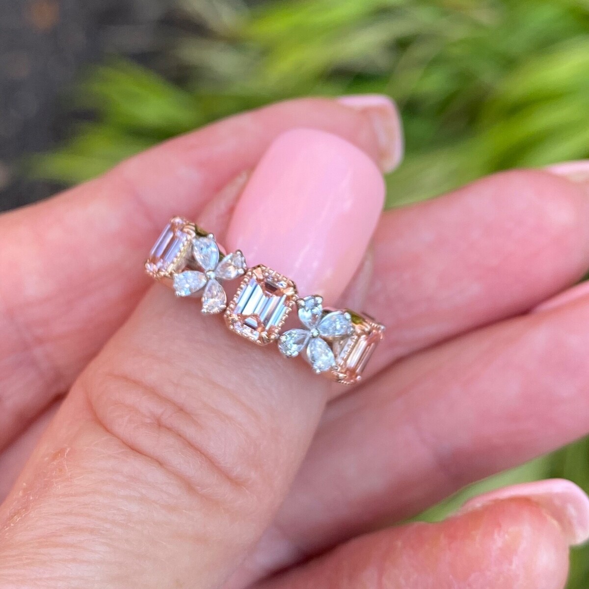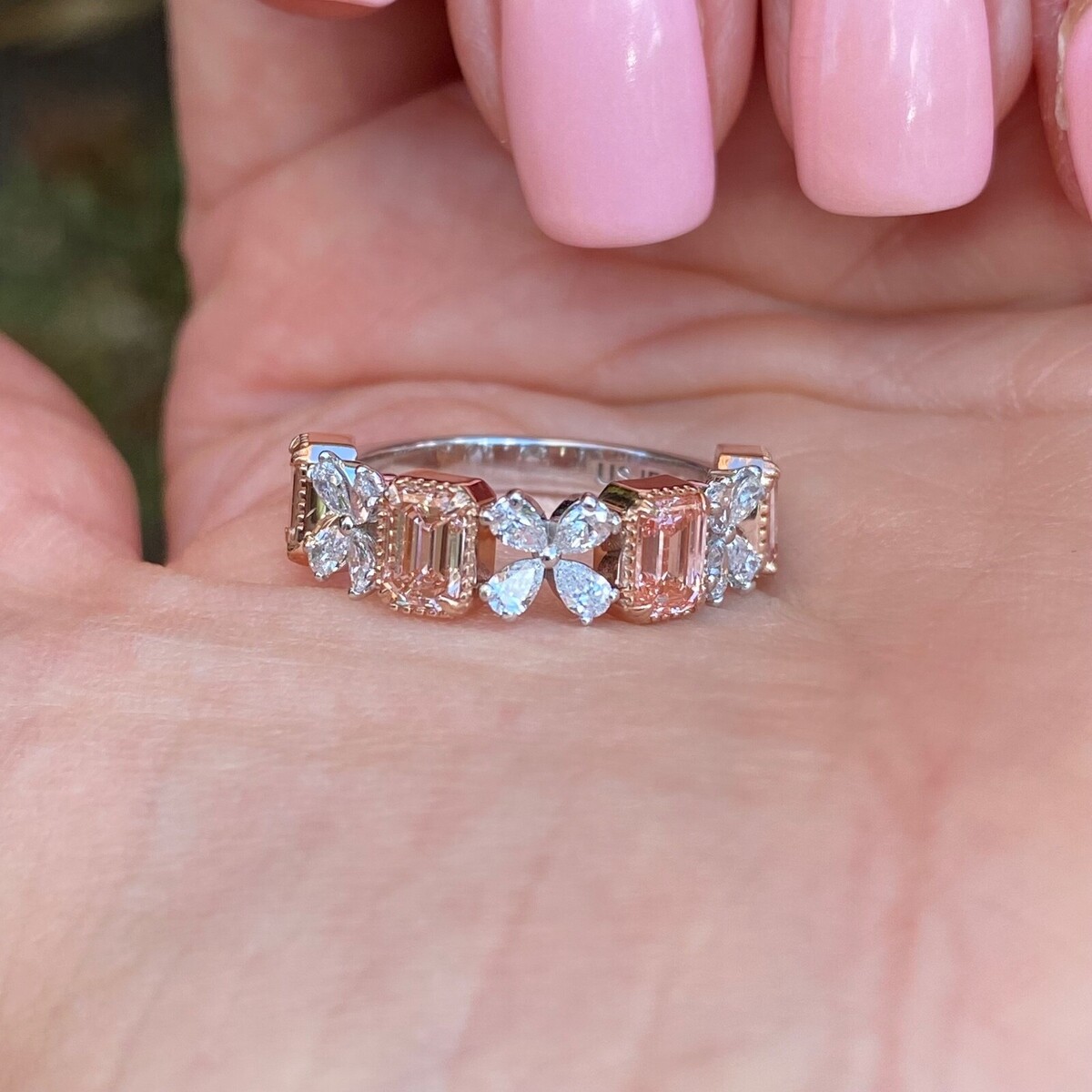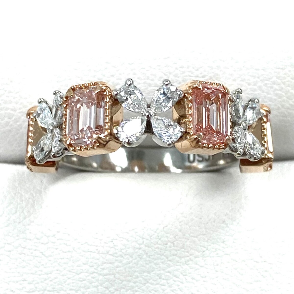 Dieser exquisite Ehering verfügt über ein atemberaubendes, abwechselndes Design mit vier ausgefallenen, intensiv rosafarbenen, im Labor gezüchteten Diamanten im Smaragdschliff und farblosen, tropfenformigen Diamanten, die in eleganten Vierergruppen eingefasst sind. Dieser aus einer harmonischen Mischung aus 14-karatigem Weiß- und Rosegold gefertigte Ring eignet sich perfekt als Ehering oder als bedeutungsvolles Jubilaumsgeschenk und symbolisiert Ihre Liebe mit zeitloser Schonheit und einzigartigem Stil. Das Gesamtkaratgewicht betragt 2,30 Karat. Unsere Produkte werden alle mit Qualitat und Sorgfalt von Hand im Herzen des Diamantenviertels in der 47. Straße in New York City hergestellt. Unser Engagement und unser Engagement für gute Arbeit und Qualitat übertreffen alle anderen. Da alle unse