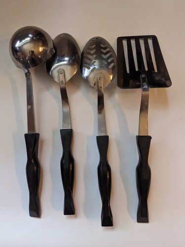 A vendre est un ensemble de 4 ensemble d'ustensiles de cuisine Cutco 17JJ Brown Swirl. L'ensemble comprend : Spatule Louche a soupe Cuillere a fentes Cuillere