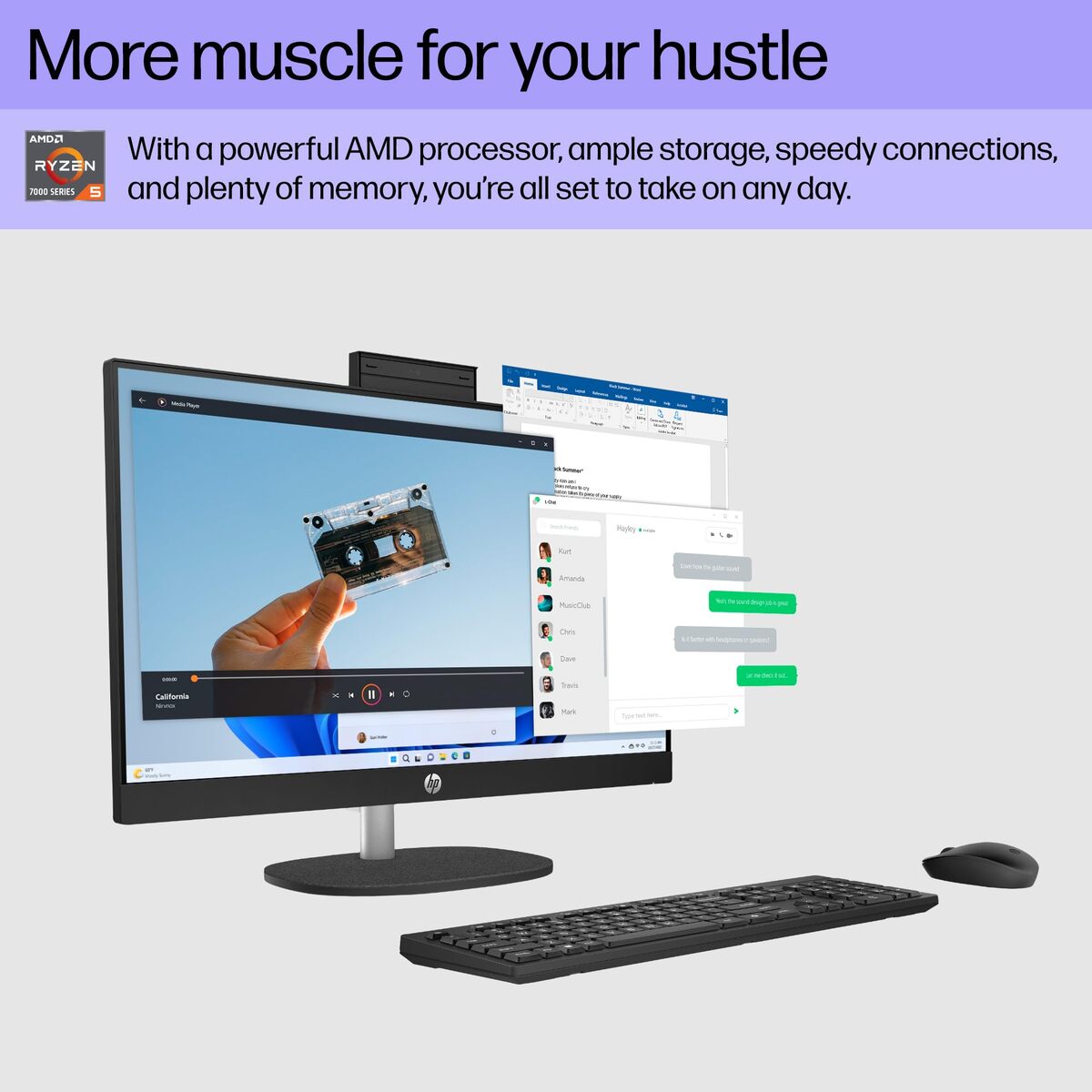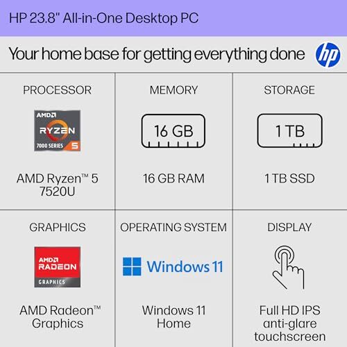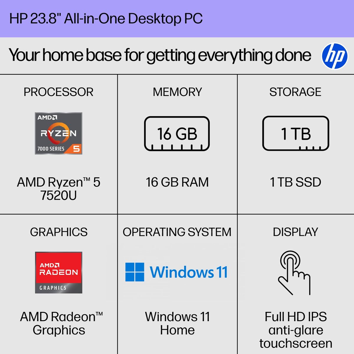 HP 23.8 inch All-in-One Desktop PC, FHD Touchscreen, AMD Ryzen 5 7520U, 16 GB RA