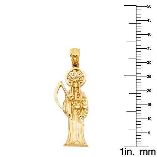 The Santa Muerte polished finish pendant necklace is a finely crafted piece of religious jewelry made from 14-karat yellow gold. This pendant, which features a skeletal figure symbolizing sacred death, measures approximately 1.18 inches in length and serves as a strong representation of faith. Designed for everyday wear, the pendant has a hollow back, ensuring it remains lightweight and comfortable throughout the day.
