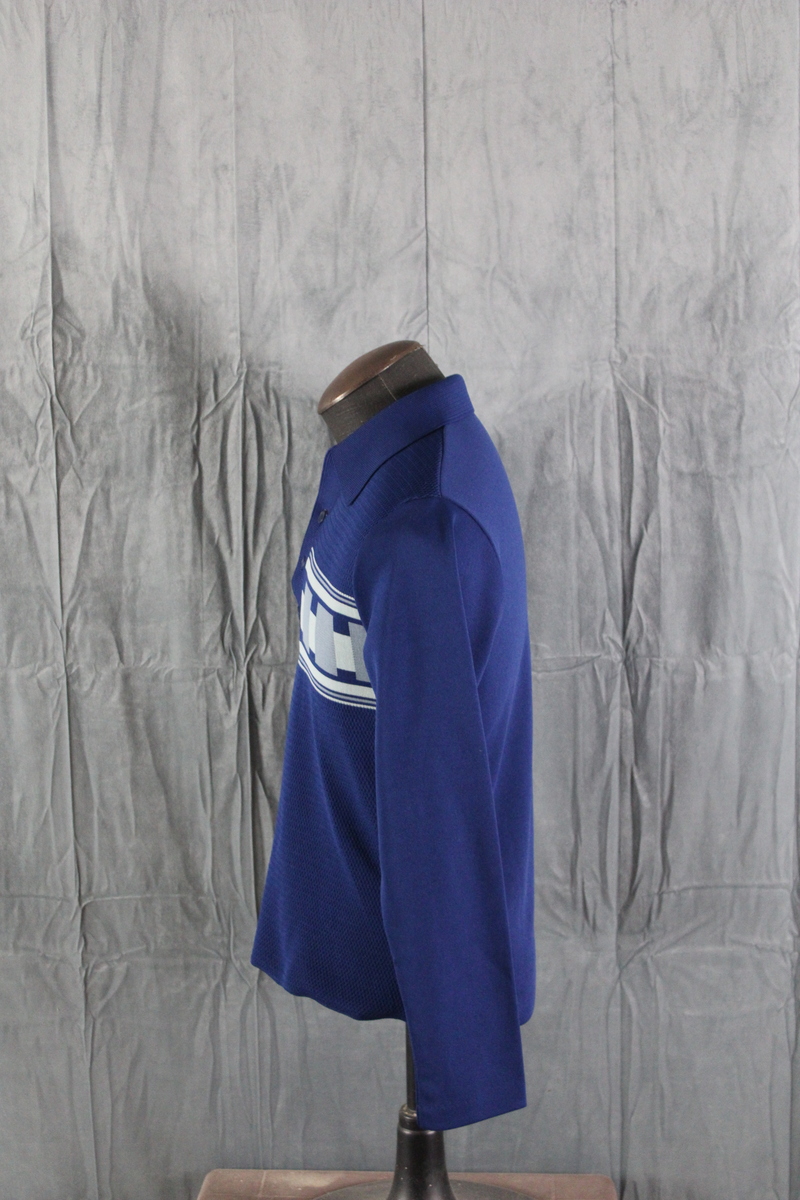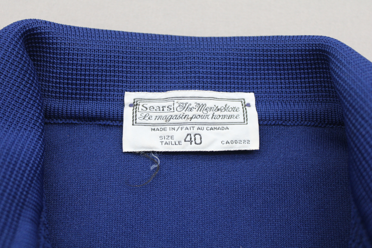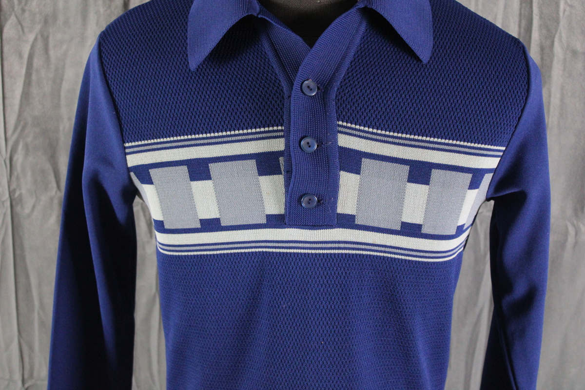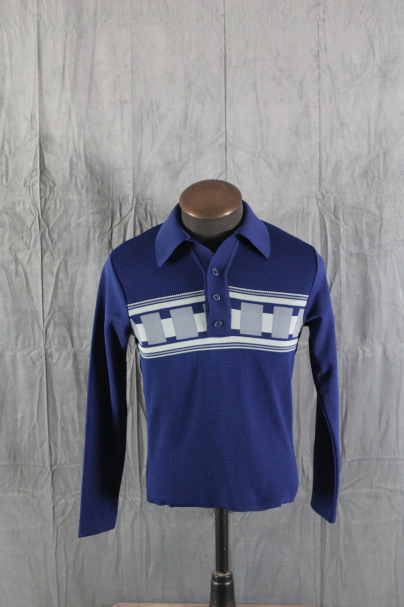 Up for sale is a vintage disco long-sleeve shirt. It has a blue base colour with a square pattern done in grey in white woven in across the chest. What a great shirt do not miss out on it.