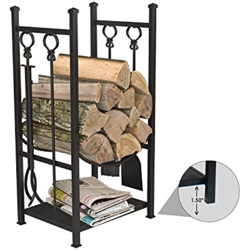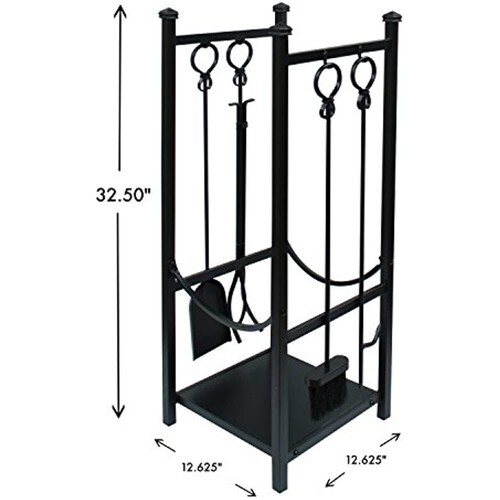 The Panacea Log Bin and Fireplace Tool Set keeps your firewood and tools in one convenient, lovely spot. This package offers all you need for an organized and attractive hearth. The significant metal stand forms a sturdy frame, with plenty of room on the 11-inch by 11-inch square base to accommodate your firewood. Integrated hooks on the stand create places to hang the included tongs, poker, broom, and shovel, to maintain the fire safely and easily. Two arched bars on the stand add curves to the dramatic unit, while a stepped detail at the top of each leg continues the look. Rings at the top of each tool contrast the square bar construction, and the black color of each item enhances your home. The metal body of the stand and tools will easily withstand the heat of the fire, and the four legs keep the set sturdy. Organize and decorate your fireplace at once using this log bin and fireplace tool set. Assembly required. Available in black color. Measures 13-inch length by 13-inch width by 32.25-inch height.