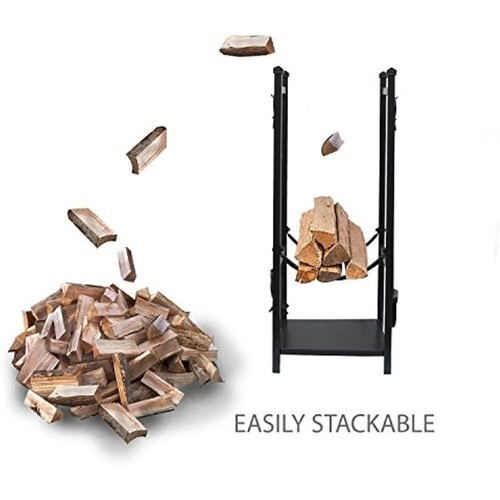 Integrated hooks on the stand create places to hang the included tongs, poker, broom, and shovel, to maintain the fire safely and easily